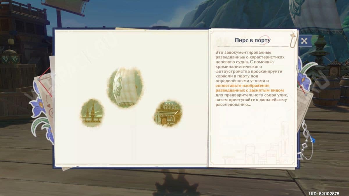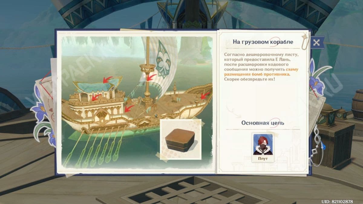 Этап состоит из двух частей. Сначала нужно найти необходимое судно, воспользовавшись подсказками от миллелитов. Сопоставьте изображение на фото с кораблями поблизости. Нужный корабль визуально похож на сумерский.
