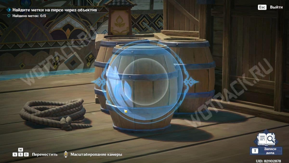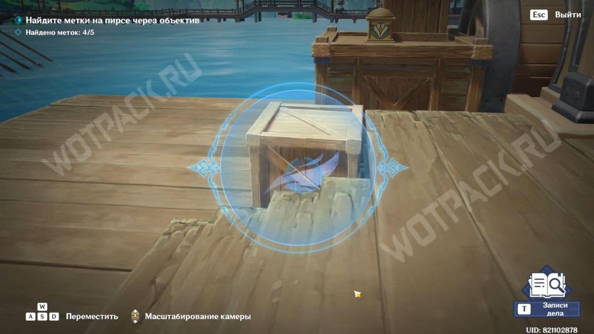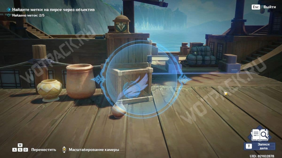 Найдите метки на пирсе через объектив. Они имеют форму особых знаков, похожих на белые перья, и сделаны при помощи специальной краски, которую видно только на фотоустройстве. Всего пять объектов: