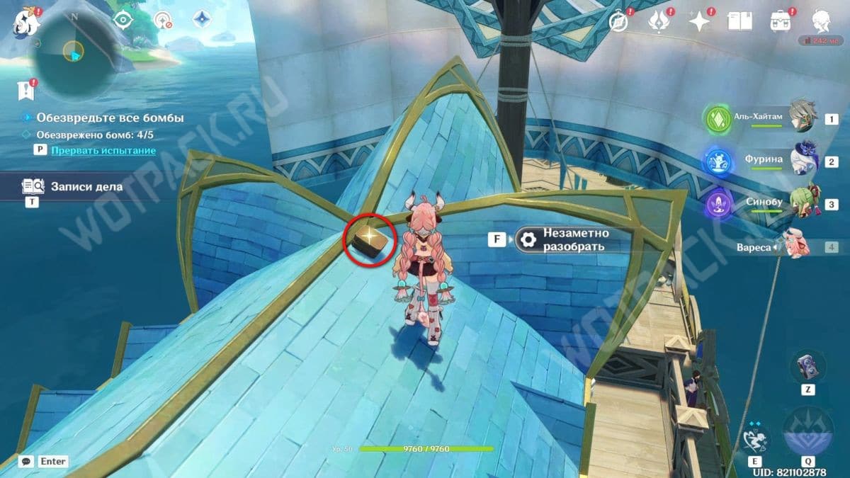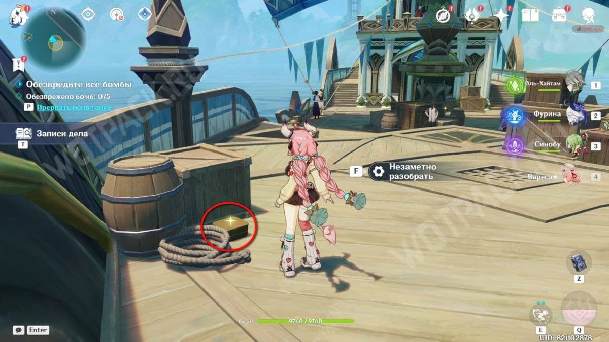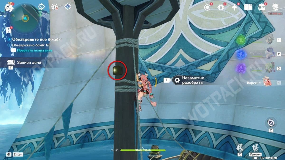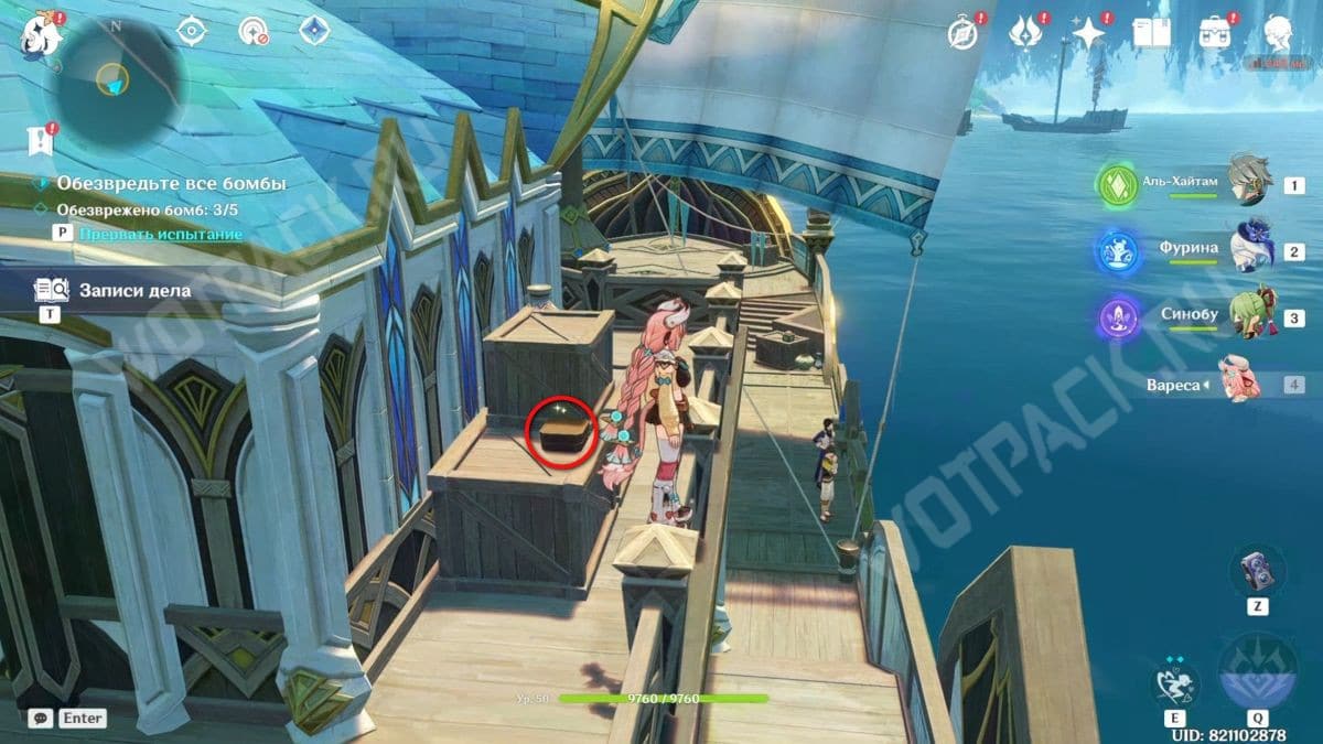 По квесту автоматически телепортируетесь на корабль в море. Внимательно изучите схему и обезвредьте все бомбы: