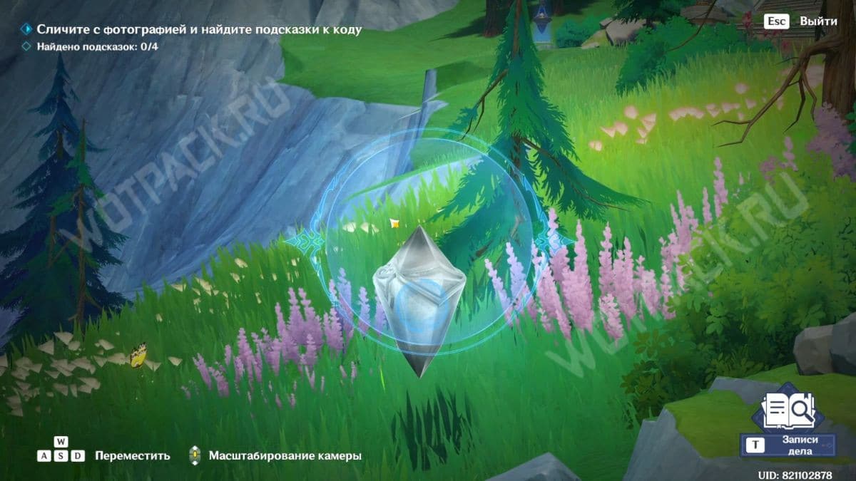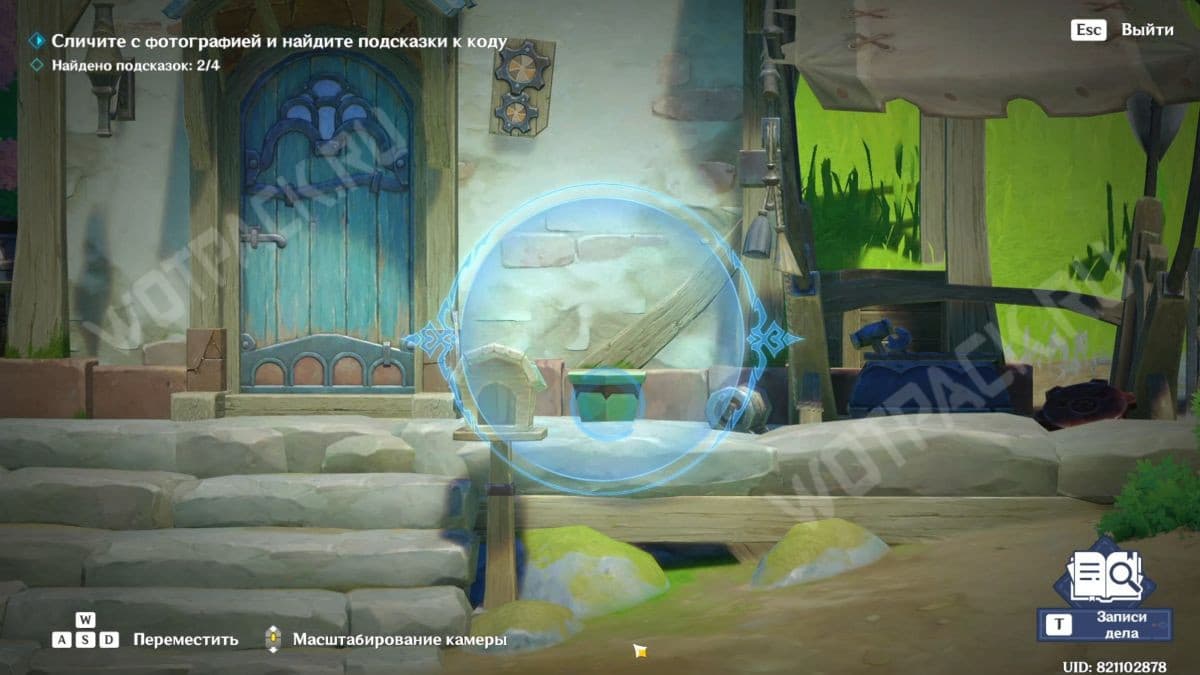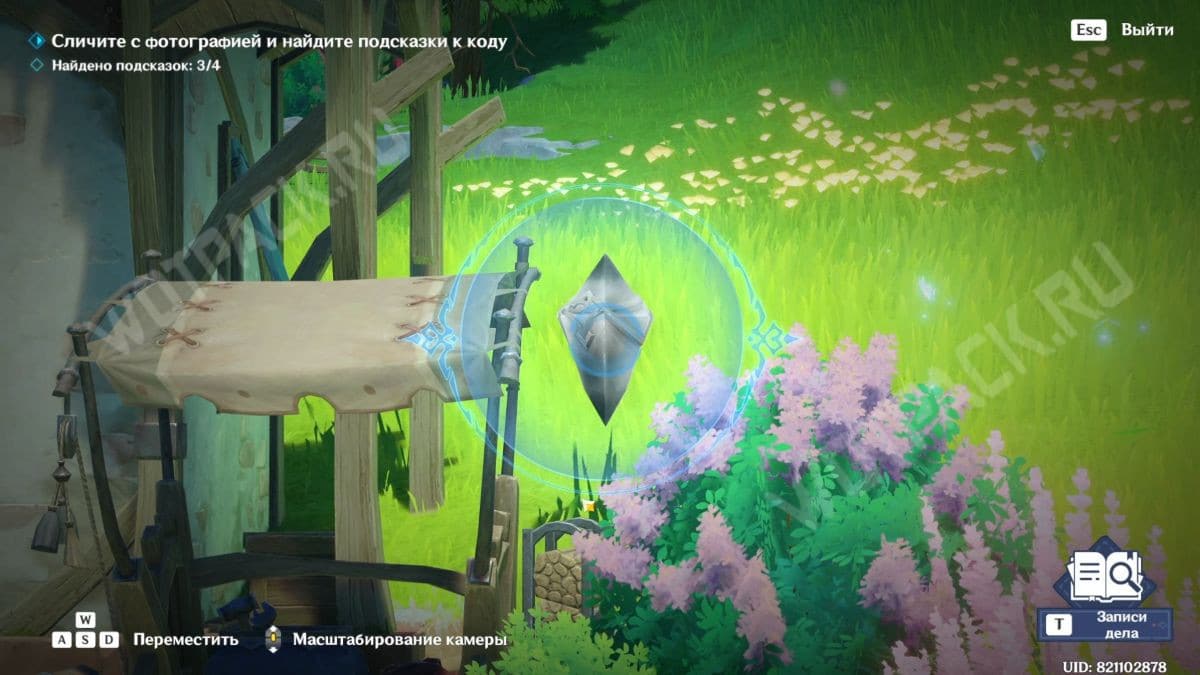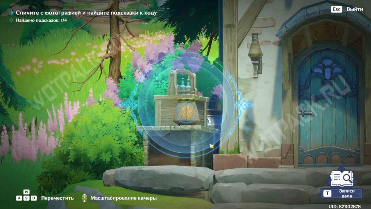 Отправляйтесь в район Берилл и поговорите с Е Лань. Нужно найти улики около дома и подсказки к коду, сверившись с фотографией: