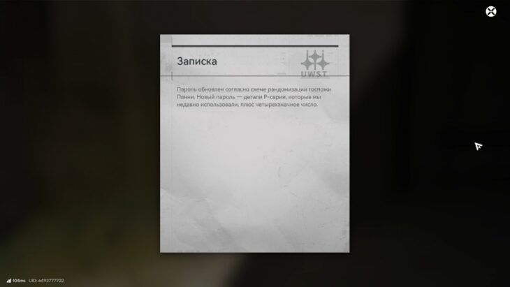 В секции с четырьмя пронумерованными переключателями требуется ввести код, ударив по ним в нужном порядке. Прочтите записку на доске объявлений у стены — в ней содержится подсказка. Обратите внимание на букву-обозначение серии деталей — P.