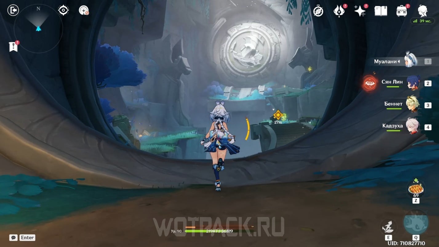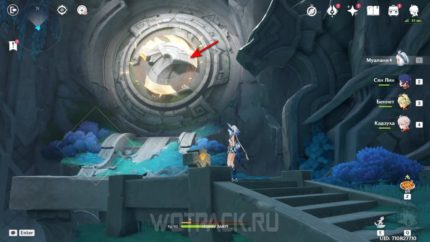 Войдите в подземелье и двигайтесь по заданию, пока не достигните этапа «Поверните механизм, чтобы получилась картинка, и откройте проход». Пройдите внутрь большой пещере и начните решение головоломки.