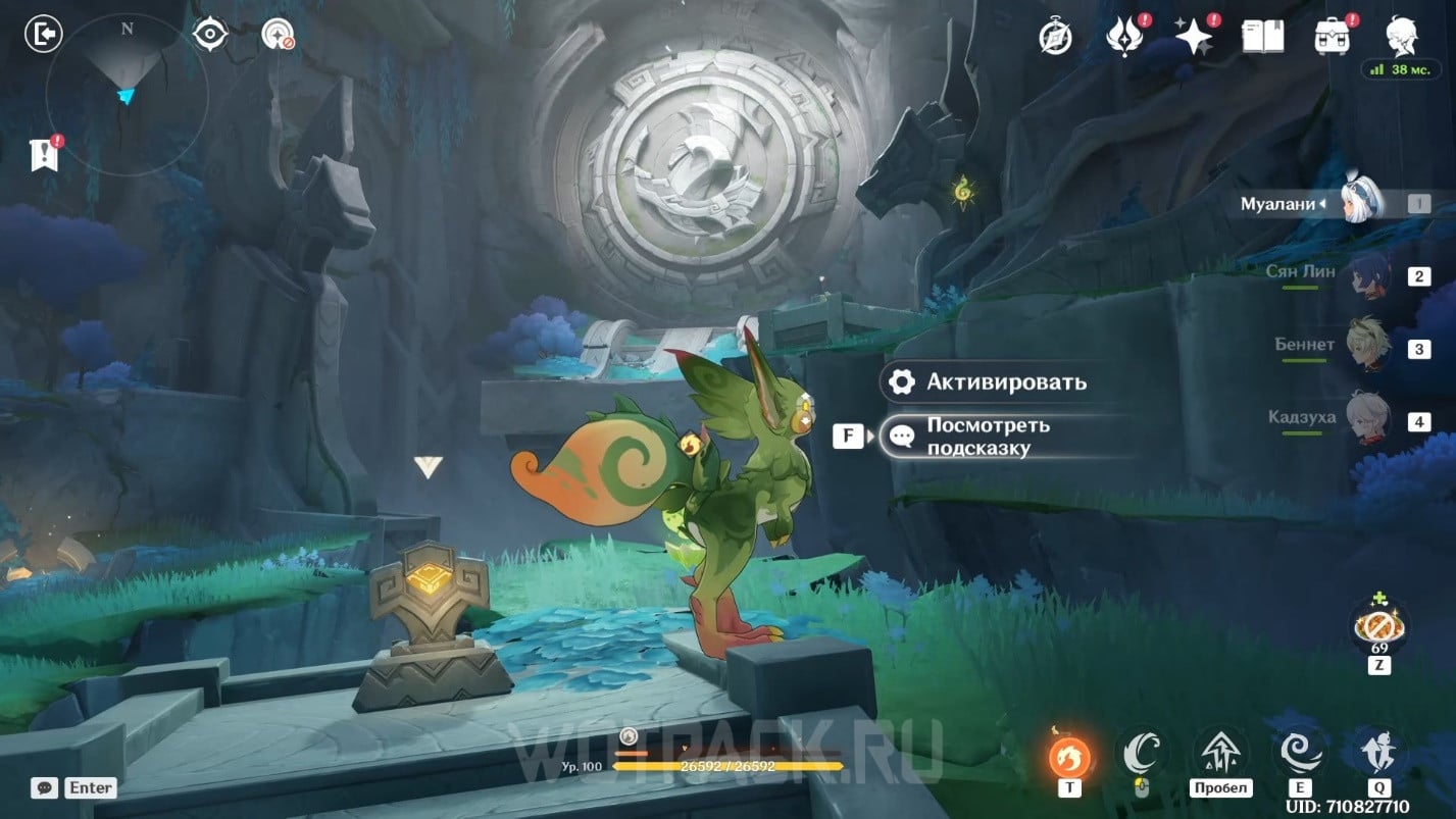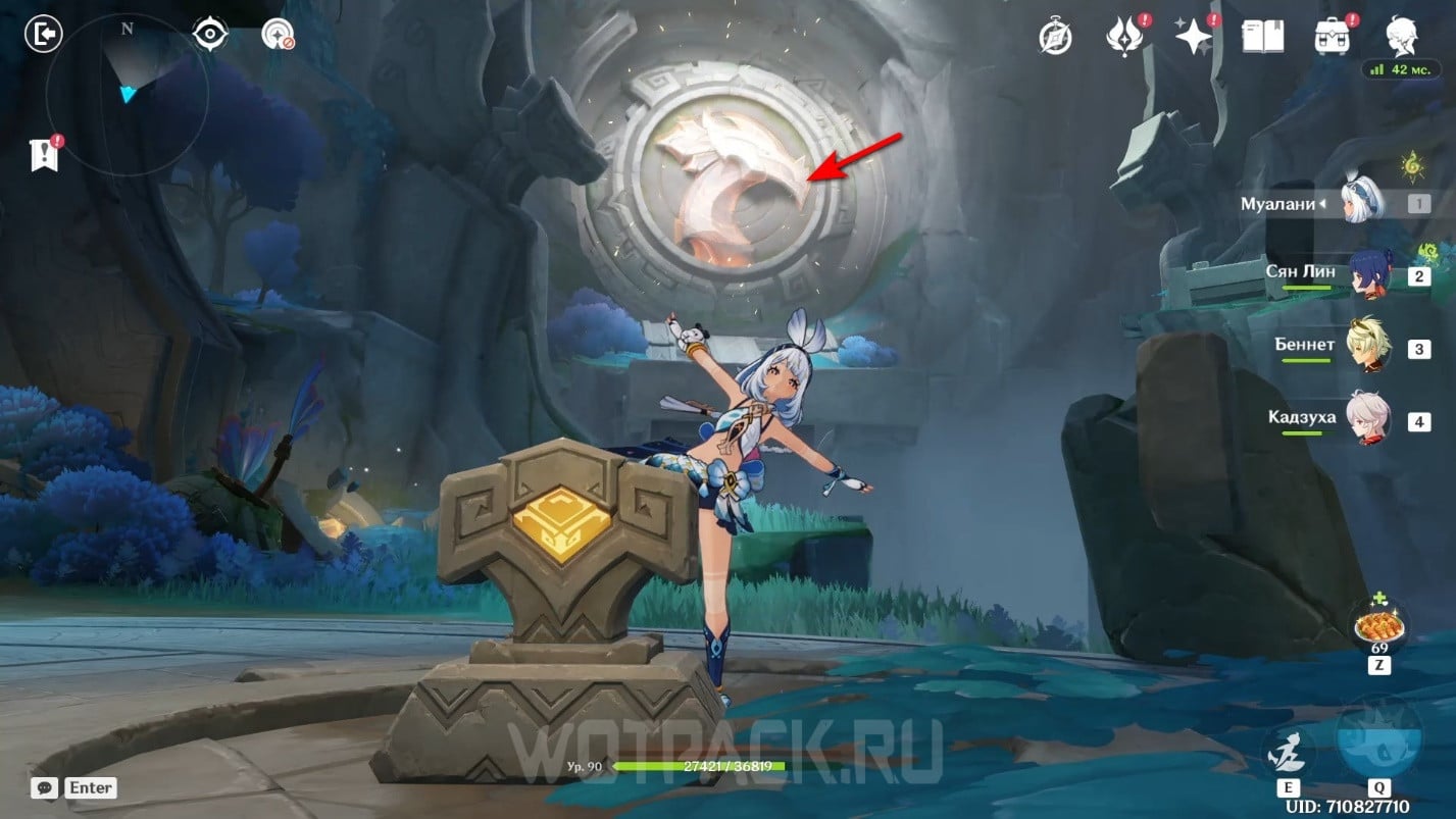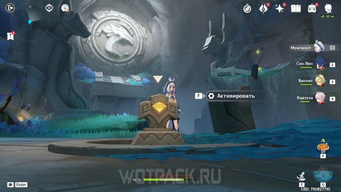 Рядом с первым механизмом находится светоч души. С помощью кнопки «Т» превратитесь в юмказавра и воспользуйтесь печатью свернутой травы, чтобы перелететь через пропасть и добраться до второго переключателя. Если на аккаунте имеется Кинич, можно воспользоваться его крюком-кошкой, а не заврианом. Оказавшись около механизма, при необходимости еще раз посмотрите подсказку. После нажмите «Активировать».