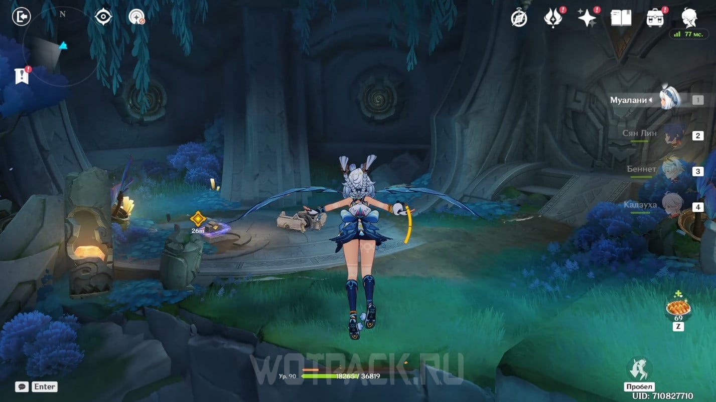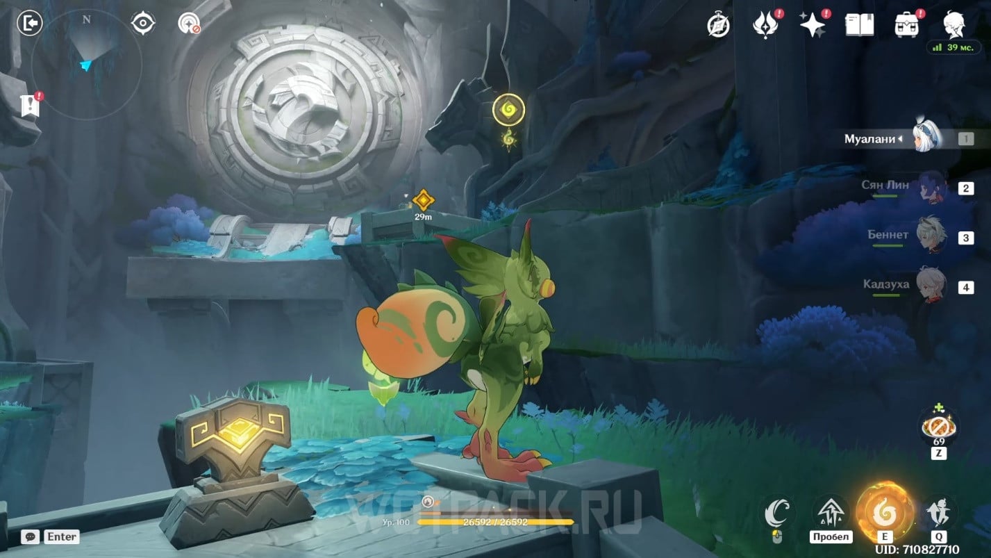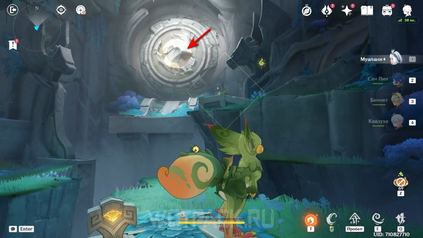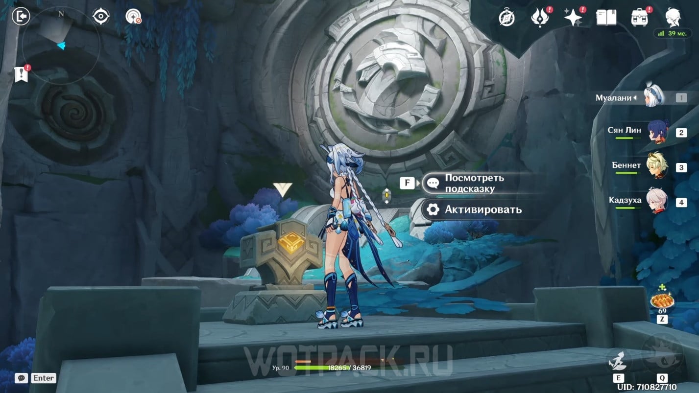 Рядом с первым механизмом находится светоч души. С помощью кнопки «Т» превратитесь в юмказавра и воспользуйтесь печатью свернутой травы, чтобы перелететь через пропасть и добраться до второго переключателя. Если на аккаунте имеется Кинич, можно воспользоваться его крюком-кошкой, а не заврианом. Оказавшись около механизма, при необходимости еще раз посмотрите подсказку. После нажмите «Активировать».