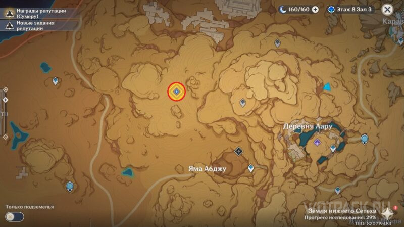 Свой путь можно начать от Статуи Архонта в деревне Аару, а после вскарабкаться на бархан, попутно пользуясь помощью четырехлистных символов (по умолчанию англ. «T»).