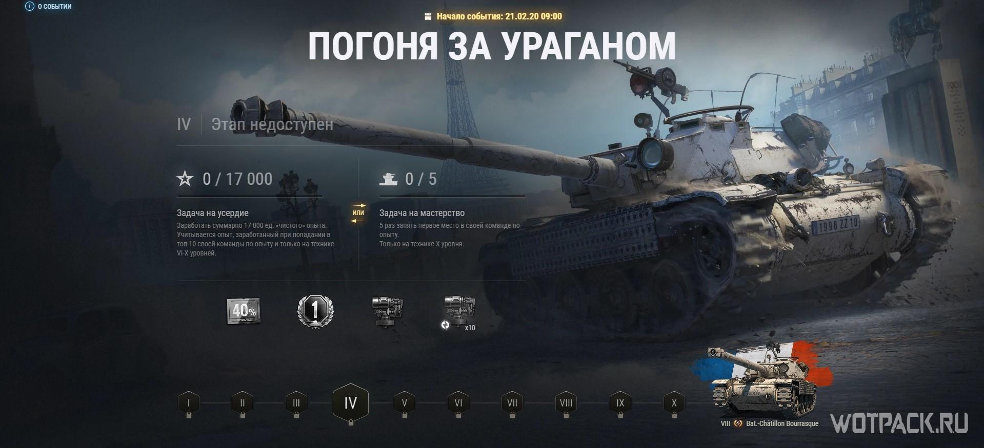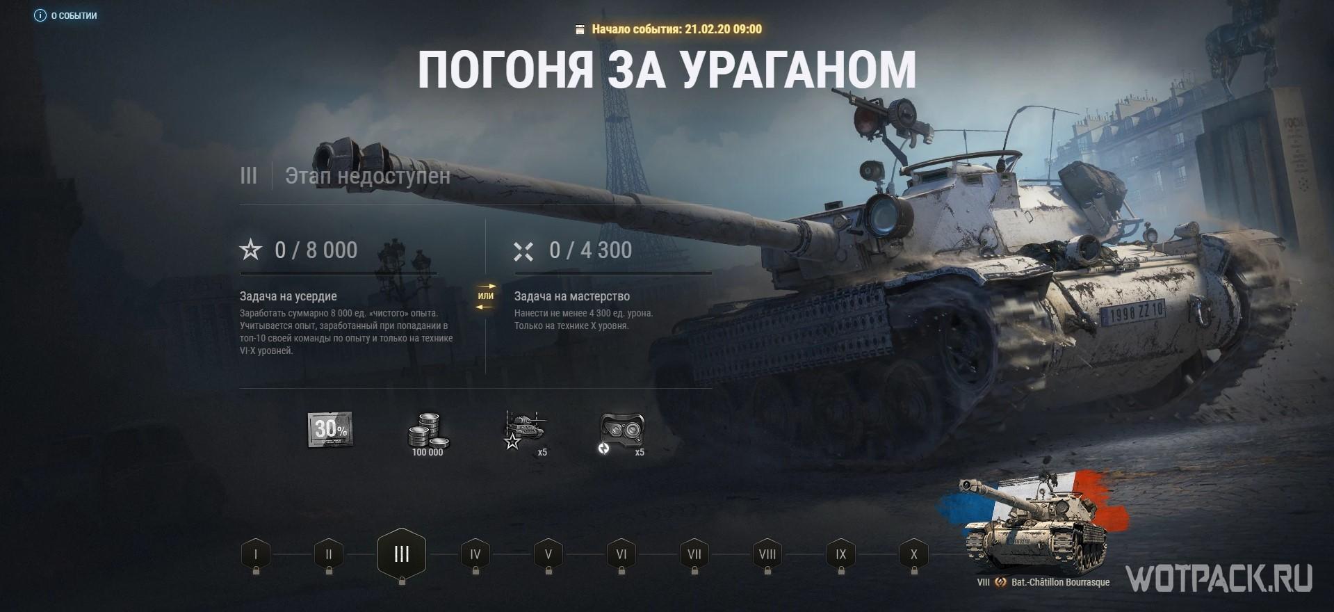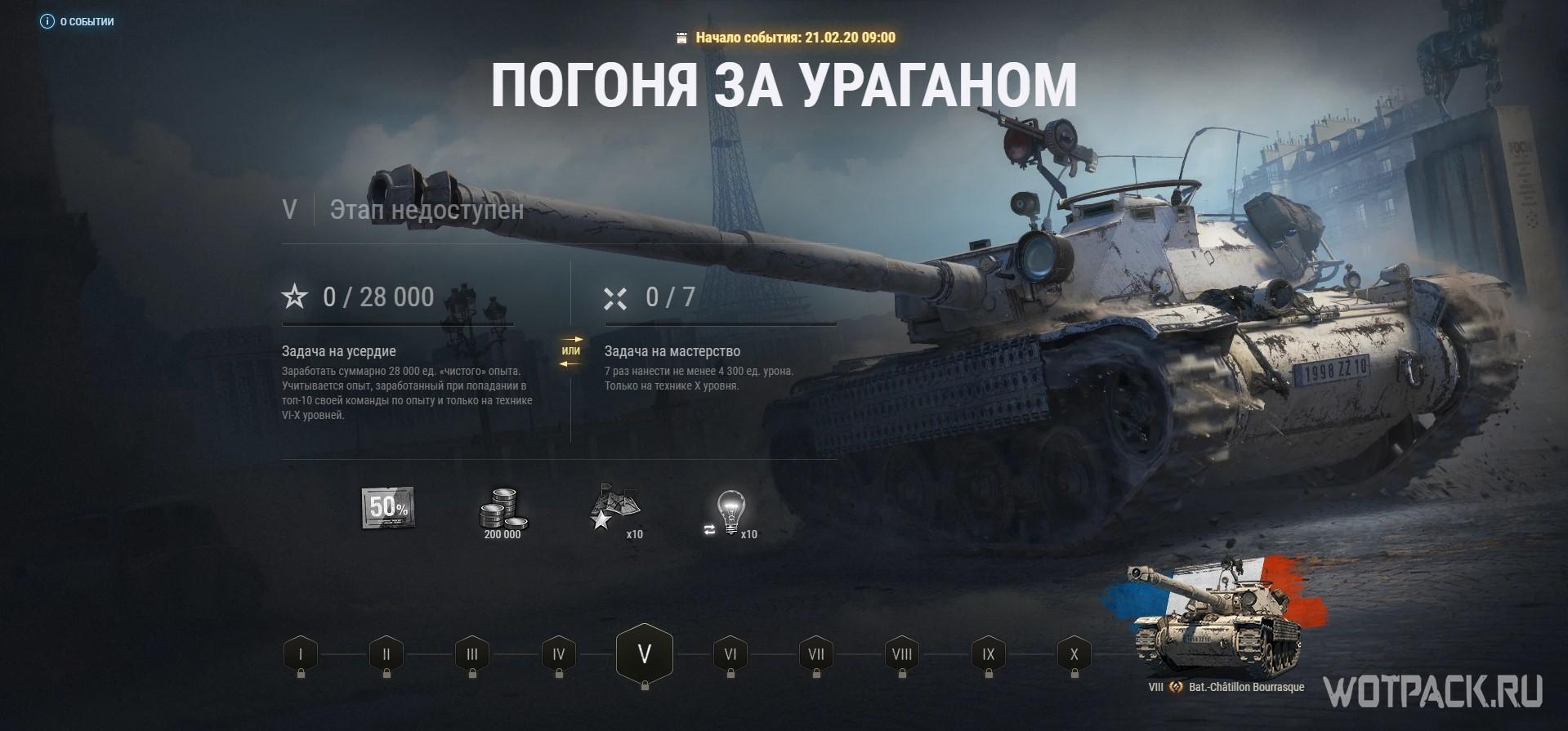 Вместо привычной «Охоты» разработчики подготовили событие «Погоня за Ураганом». Это хорошая возможность накануне старта Линии Фронта получить бесплатный премиумный французский средний танк 8 уровня Bat.-Châtillon Bourrasque.