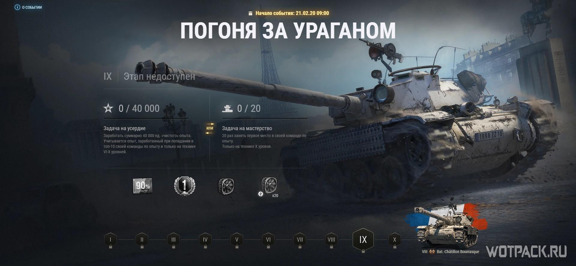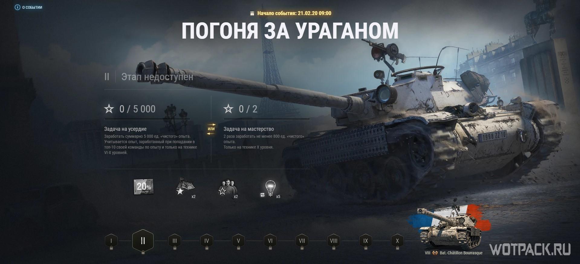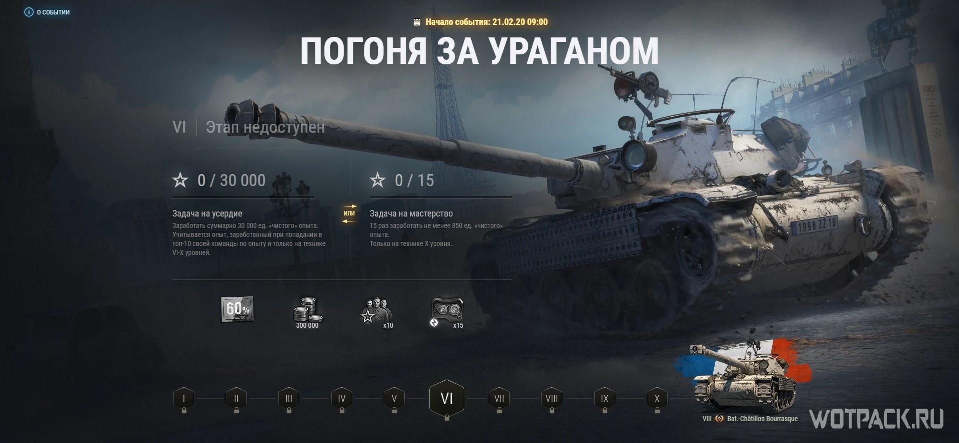 Вместо привычной «Охоты» разработчики подготовили событие «Погоня за Ураганом». Это хорошая возможность накануне старта Линии Фронта получить бесплатный премиумный французский средний танк 8 уровня Bat.-Châtillon Bourrasque.