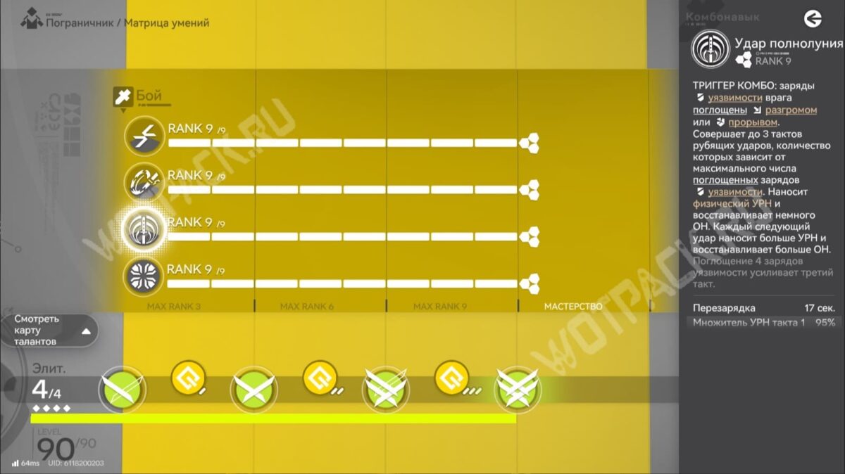 - Комбо «Удар полнолуния» — становится доступным, когда заряды уязвимости у врага поглощаются разгромом или прорывом. Наносит повреждения и заполняет шкалу ОН.