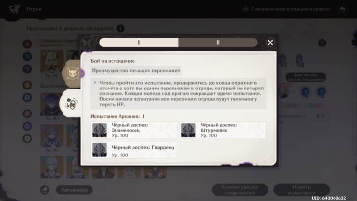 В первом зале скиньте более слабых и спорных союзников, например, медсестру Сиджвин или пастора Далию, но если на аккаунте нет хороших лекарей, мелюзину лучше приберечь для первого Аркана. Пробного Пиро Архонта придержите для второго испытания на Аркан, если не имеете других героев огненной стихии. По возможности стоит хотя бы один раз вытянуть компаньона любой стихии.