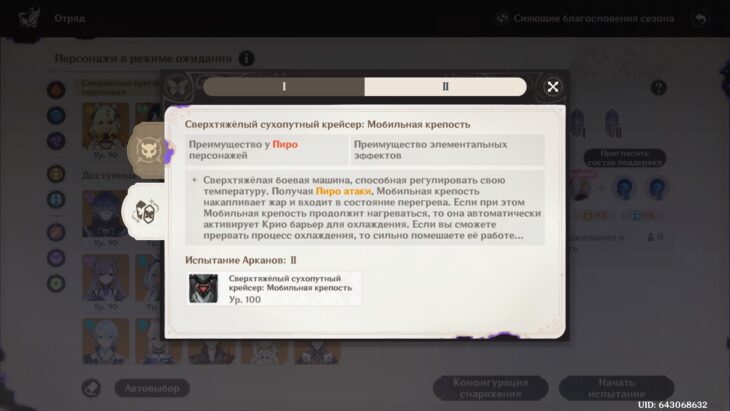 - Второй Аркан — на сцене ожидает опасный противник Сверхтяжёлый сухопутный крейсер: Мобильная крепость. Он обладает особой механикой терморегуляции, и против него стоит брать огненных героев.