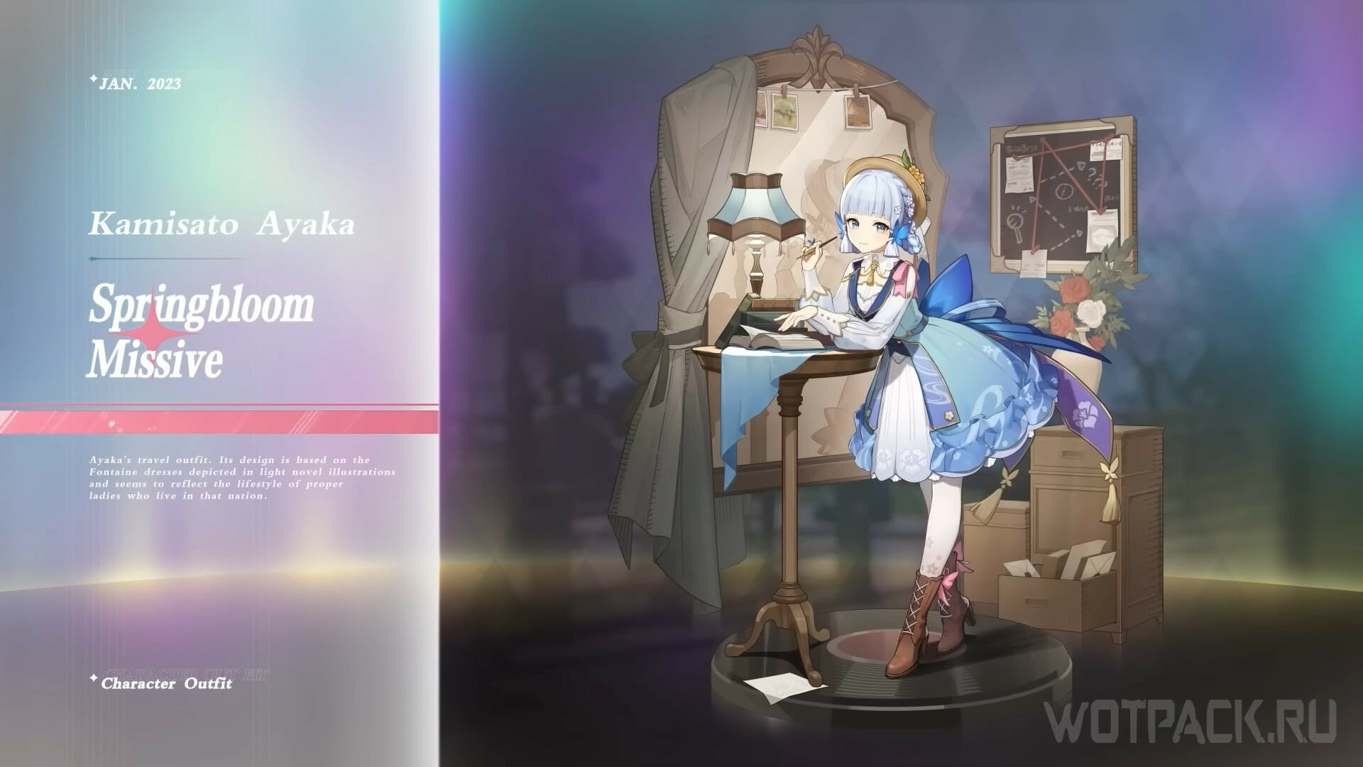 Наследница клана Камисато Аяка также получит новый наряд в рамках одного из игровых событий. В ходе ивента «Воинский дух» Крио мечница появится в сюжете в новом наряде, вдохновленном модой Фонтейна. Редкость костюма оценивается в 4⭐, тем не менее, получить его бесплатно не получится. Скин будет добавлен в игровой магазин, а в течение всего обновления 3.4 его можно будет приобрести со скидкой за 1 350 кристаллов Сотворения.
