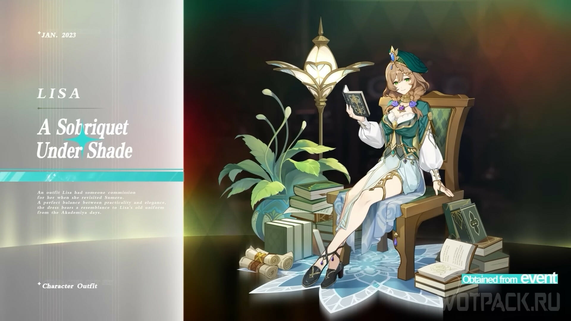 Библиотекарь Ордо Фавониус Лиза наконец получит образ в стиле своей альма-матер — сумерской Академии, лучшей выпускницей которой и является знакомая всем Электро каталистка. Скин можно будет получить бесплатно, за прохождение события «Второе цветение», посвященное изучению артерий земли на территории Дендро королевства, в ходе которого Лиза предстанет перед Путешественником в новом виде.