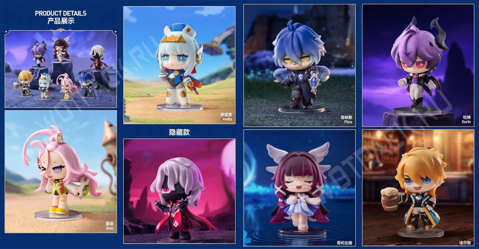 Они будут продаваться в формате гачи, то есть в приобретённой коробке случайным образом попадётся один из семи персонажей: механик Айно, дракон Дурин, магистр Варка, светоносец Флинс, Коломбина Гипоселениа, робот Инеффа, а с небольшой вероятностью Лунный мститель Рери (как «секретка» с шансом 1 к 72).