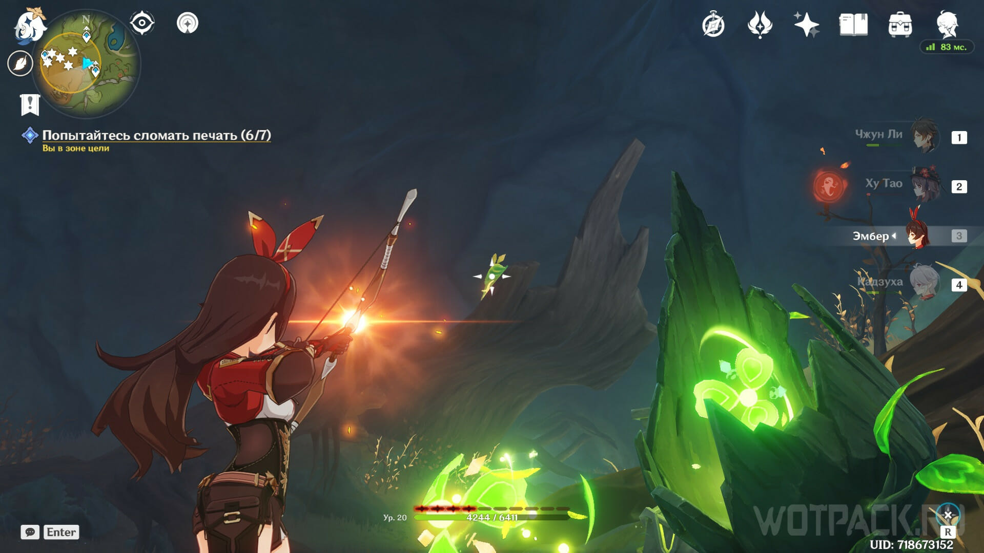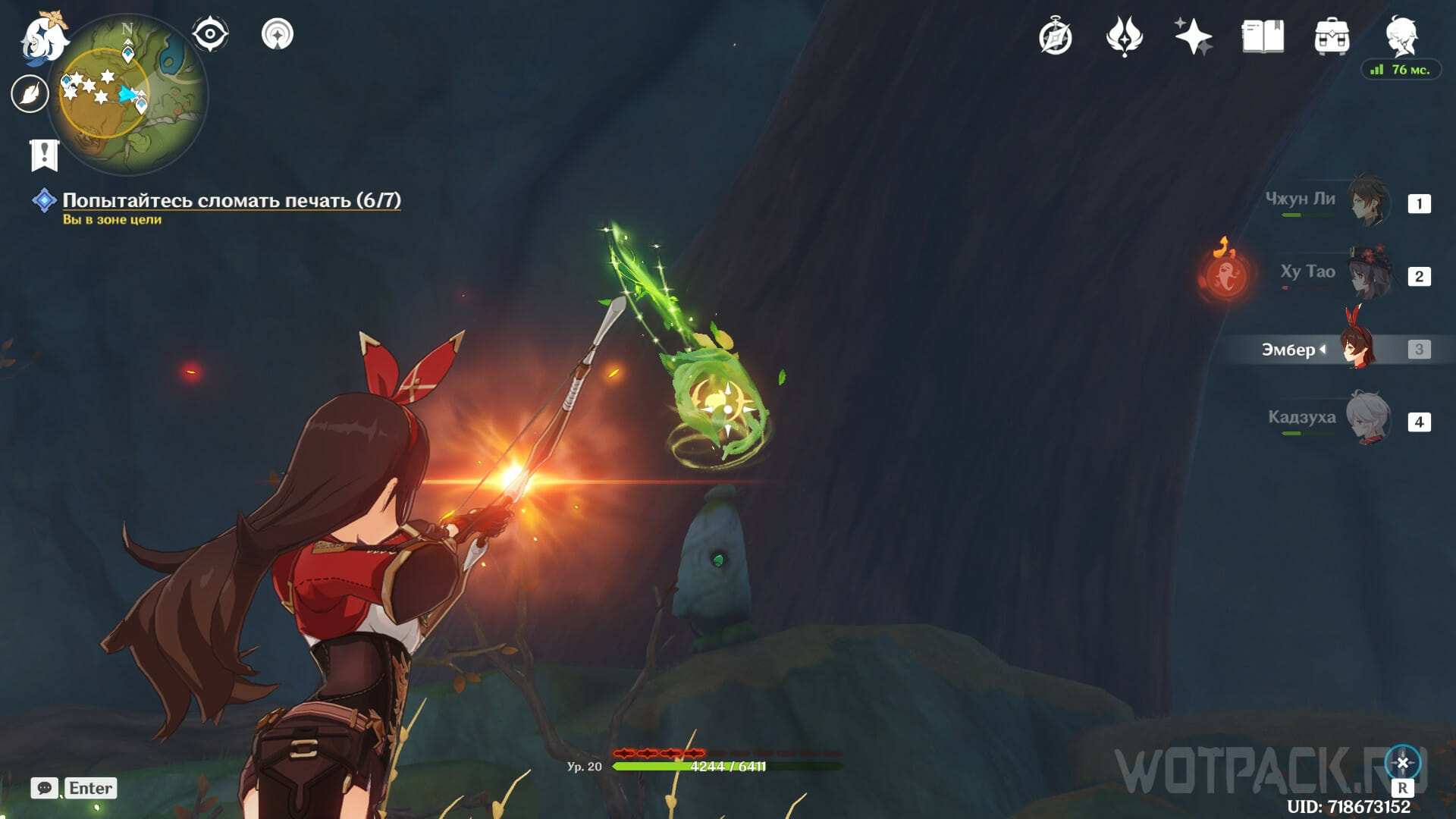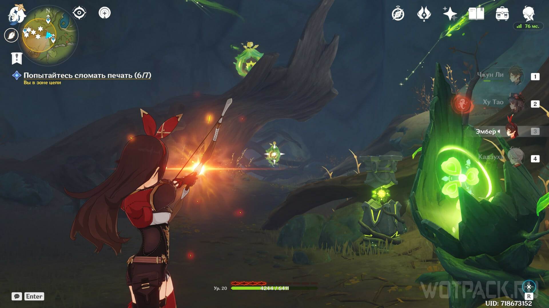 Возьмите в отряд любого героя с элементом Пиро, но практичнее использовать Эмбер или Янь Фэй, чтобы каждый раз не ждать перезарядку навыка. Поджигайте печати, пока не закончится зеленая шкала сверху.