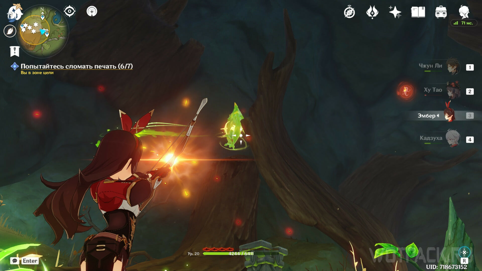 Подберите здоровый Дендрогранум и ударьте из лука по парящим Дендро эмблемам. Первая нависла над ветвями, вторая — над разрушенной печатью, третья — под ветвями у дальней стены, последняя — над свечой жизни. Не забывайте брать Дендрогранум для каждого выстрела.