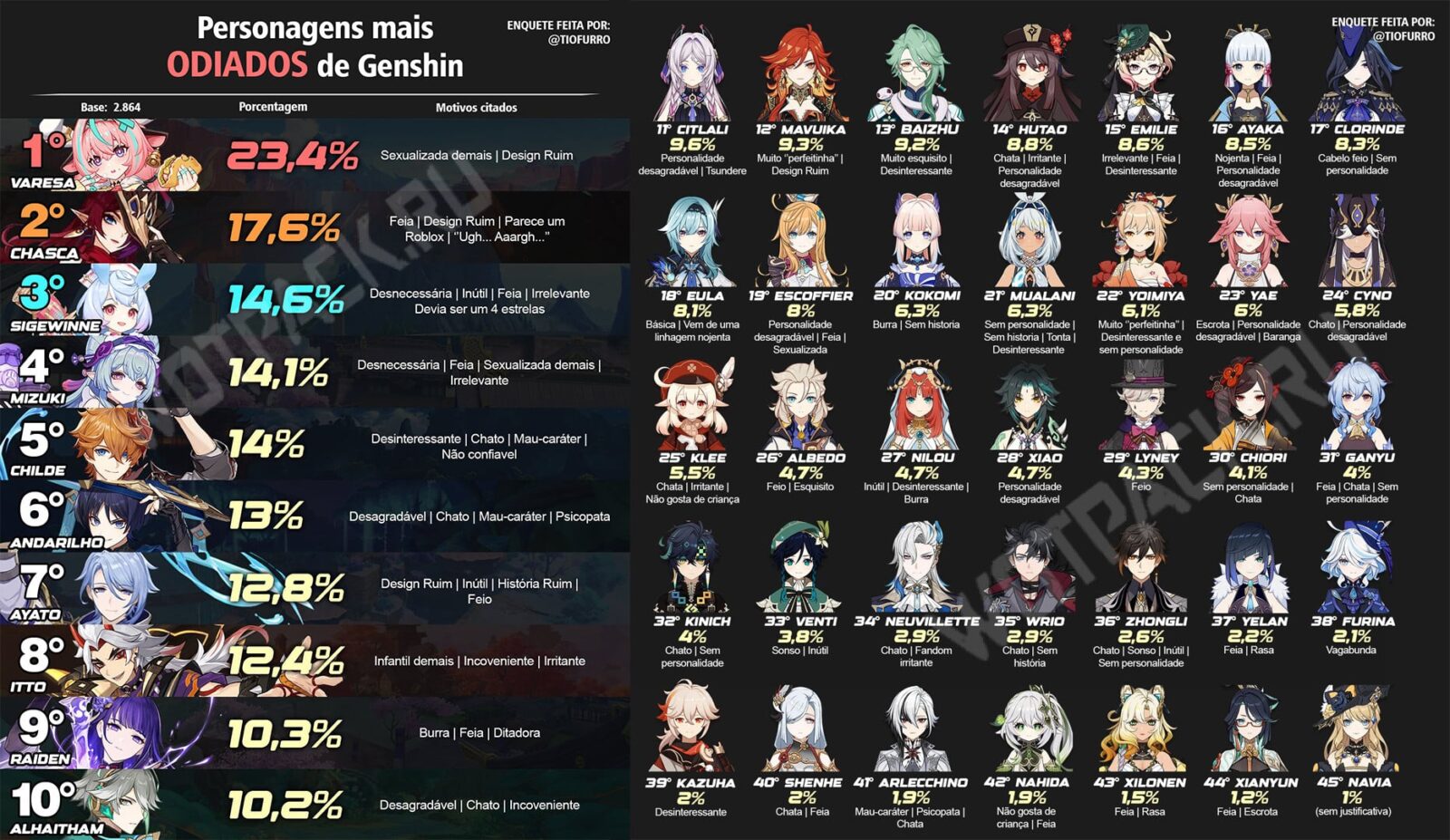 В социальных сетях португальские игроки провели голосование — пользователь под ником @tiofurro___ собрал мнение 2864 геймеров относительно того, кто в Genshin Impact их самый нелюбимый герой и почему. Из указанного примерного количества голосов следует вывод, что называли не только кого-то одного, но и сразу нескольких кандидатов. Результаты опроса следующие:
