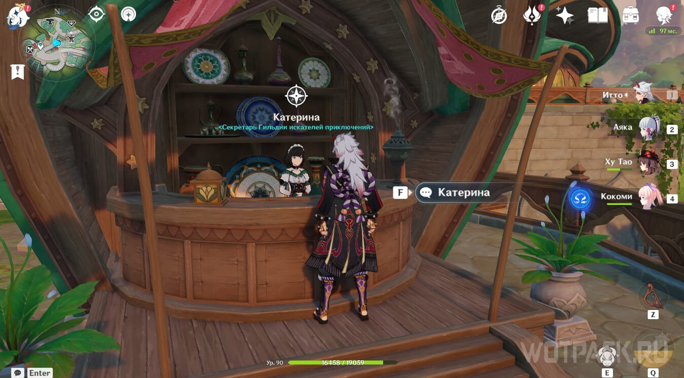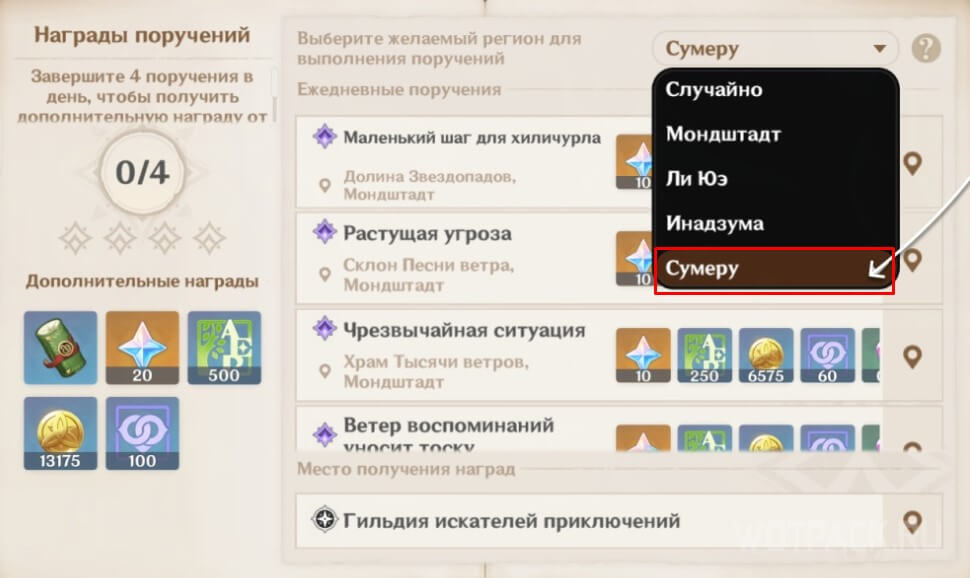 Переместитесь на точку телепортации в городе Сумеру, а затем пройдите в местную Гильдию искателей приключений. После начните диалог с Катериной о получении новых поручений, и возможность выбора Сумеру в качестве региона для ежедневных миссий разблокируется.