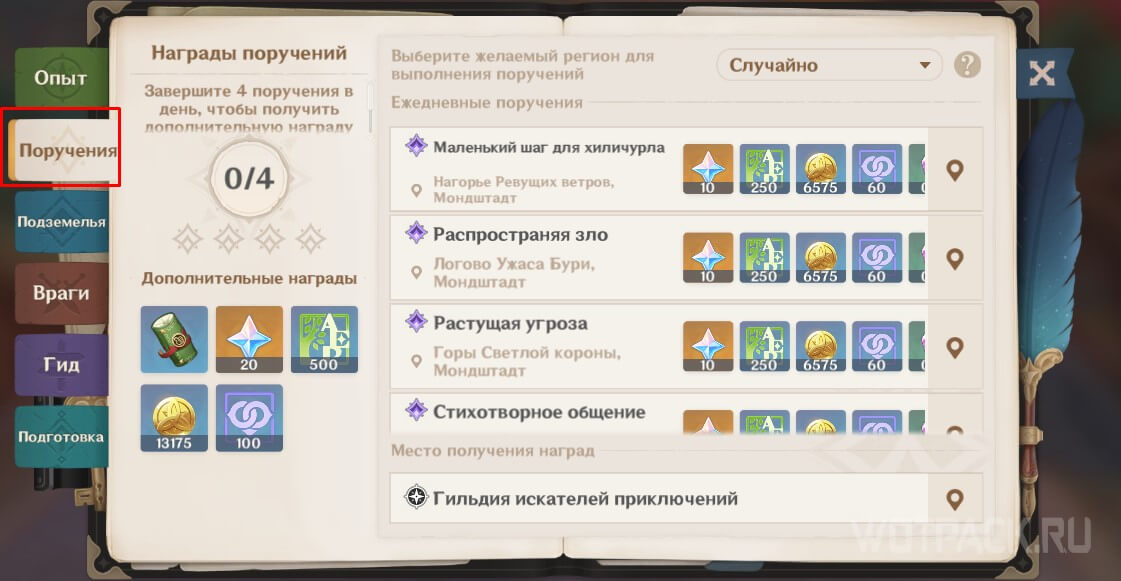 На следующий день в реальном времени перейдите в Справочник искателя приключений, нажав на метку книги в правом верхнем углу экрана. Откройте вкладку Поручения и выберите Сумеру в качестве желаемого региона для выполнения дейликов. После этого каждый следующий день в мире будут появляться поручения в Дендро регионе.