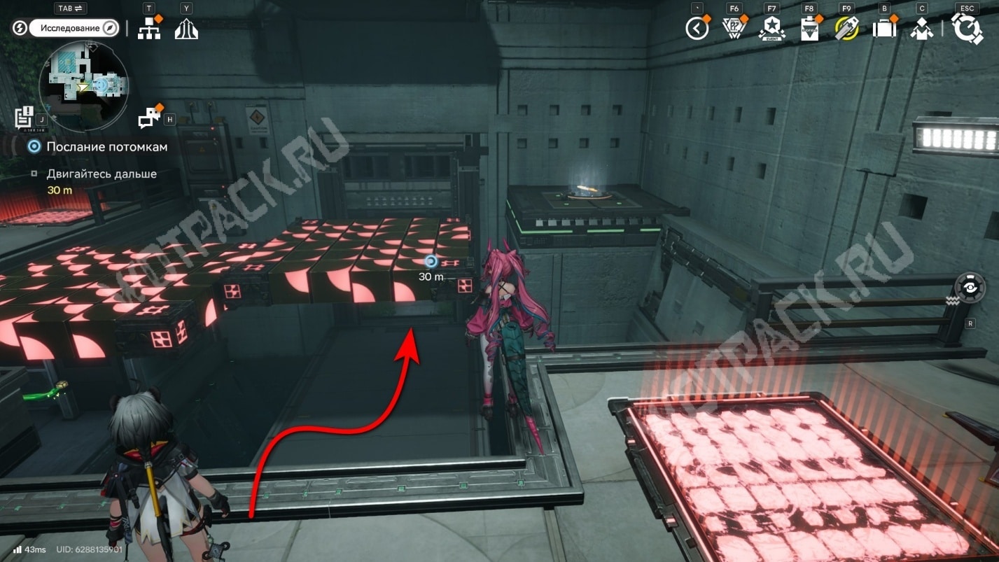 Двигаясь по балкону В, дойдите до конца и спуститесь по лестнице, где увидите трамплин. С его помощью заберитесь в комнату с меткой.