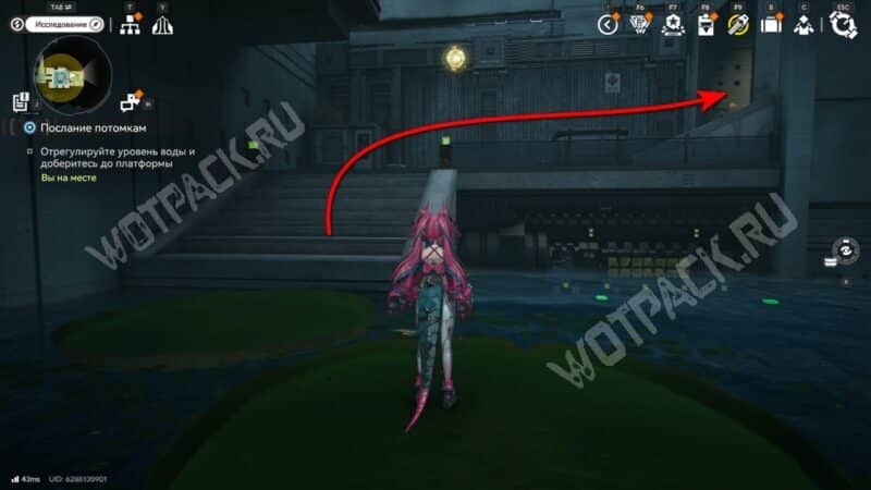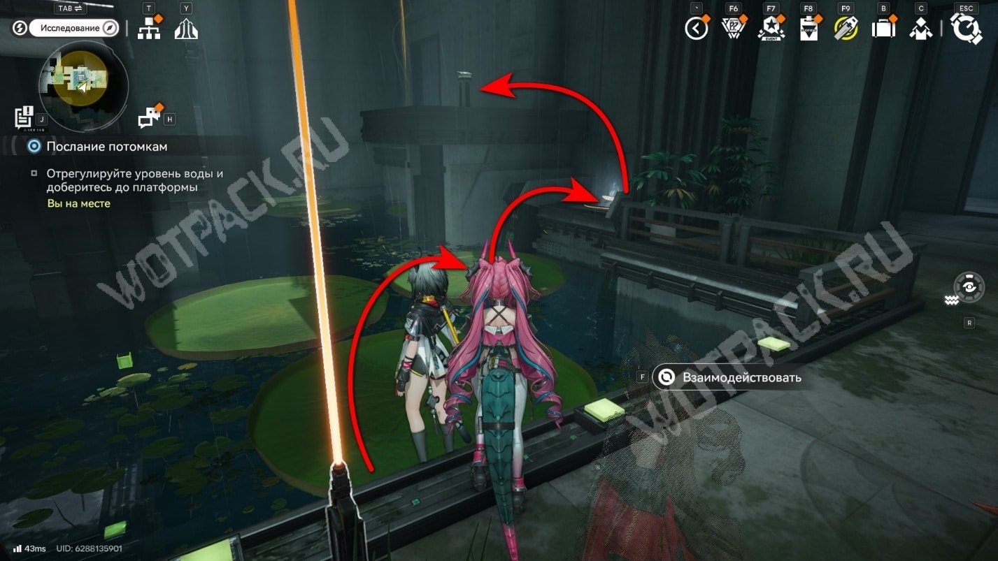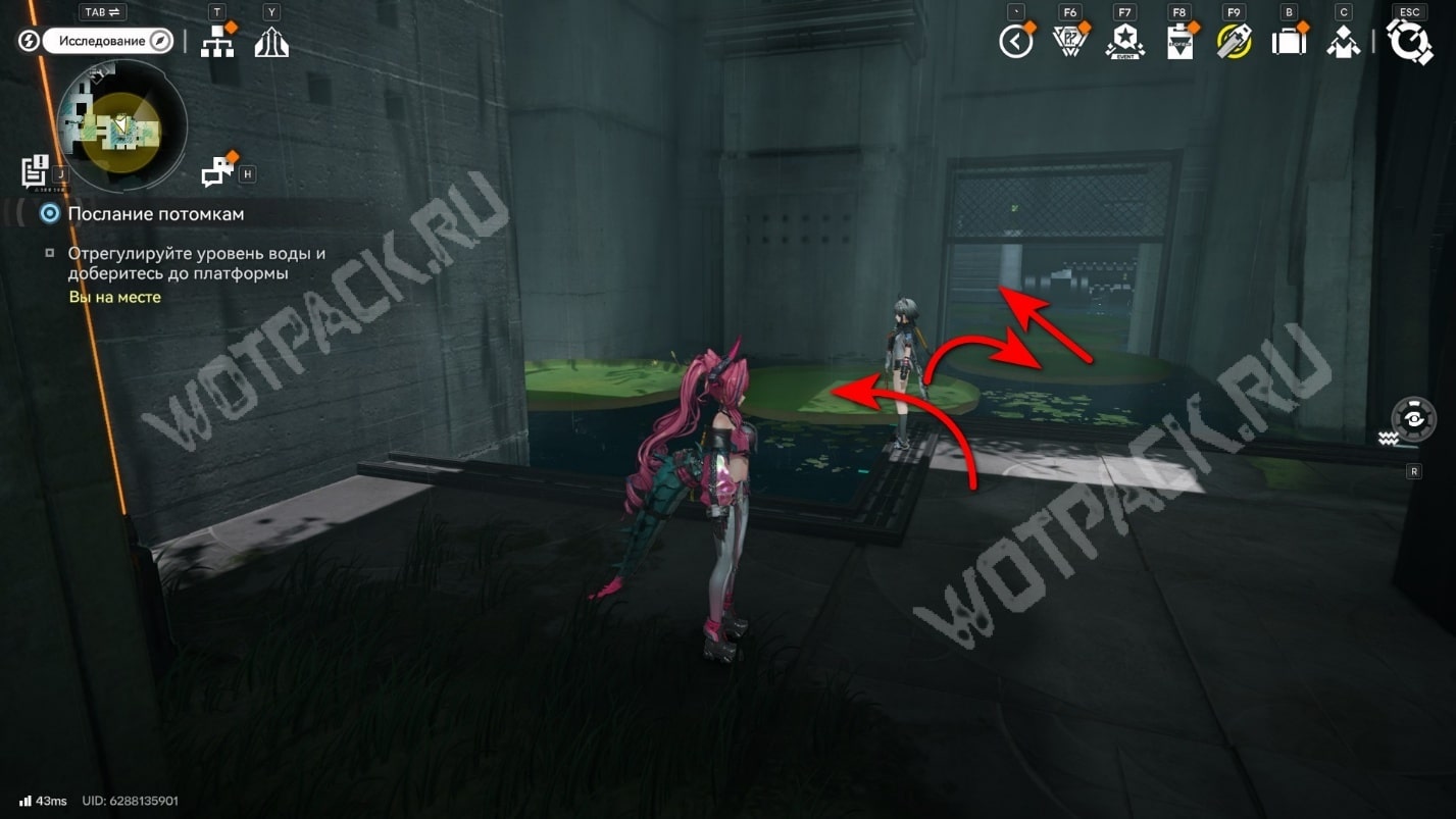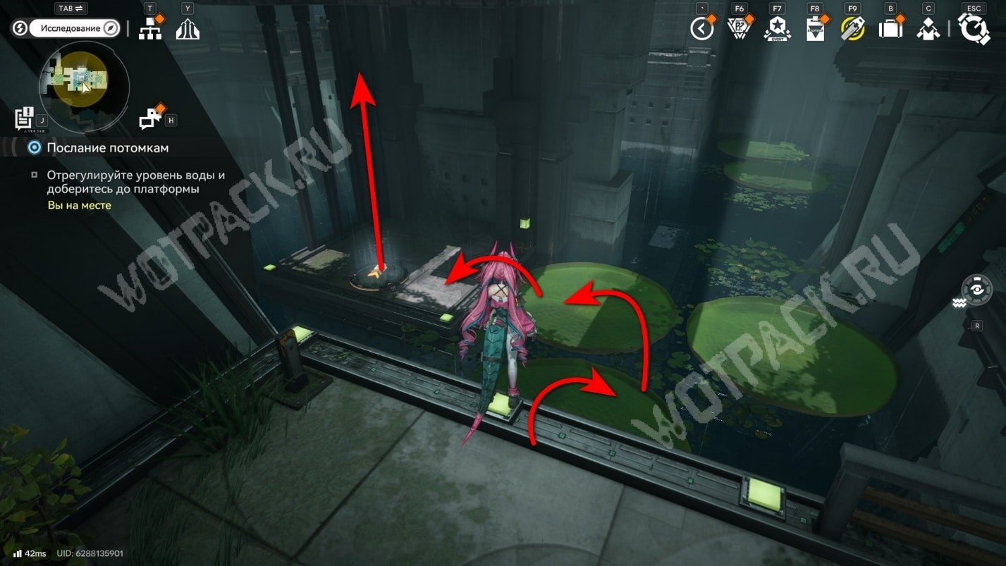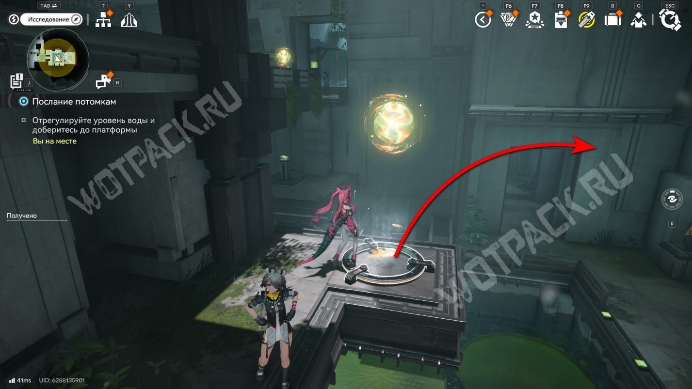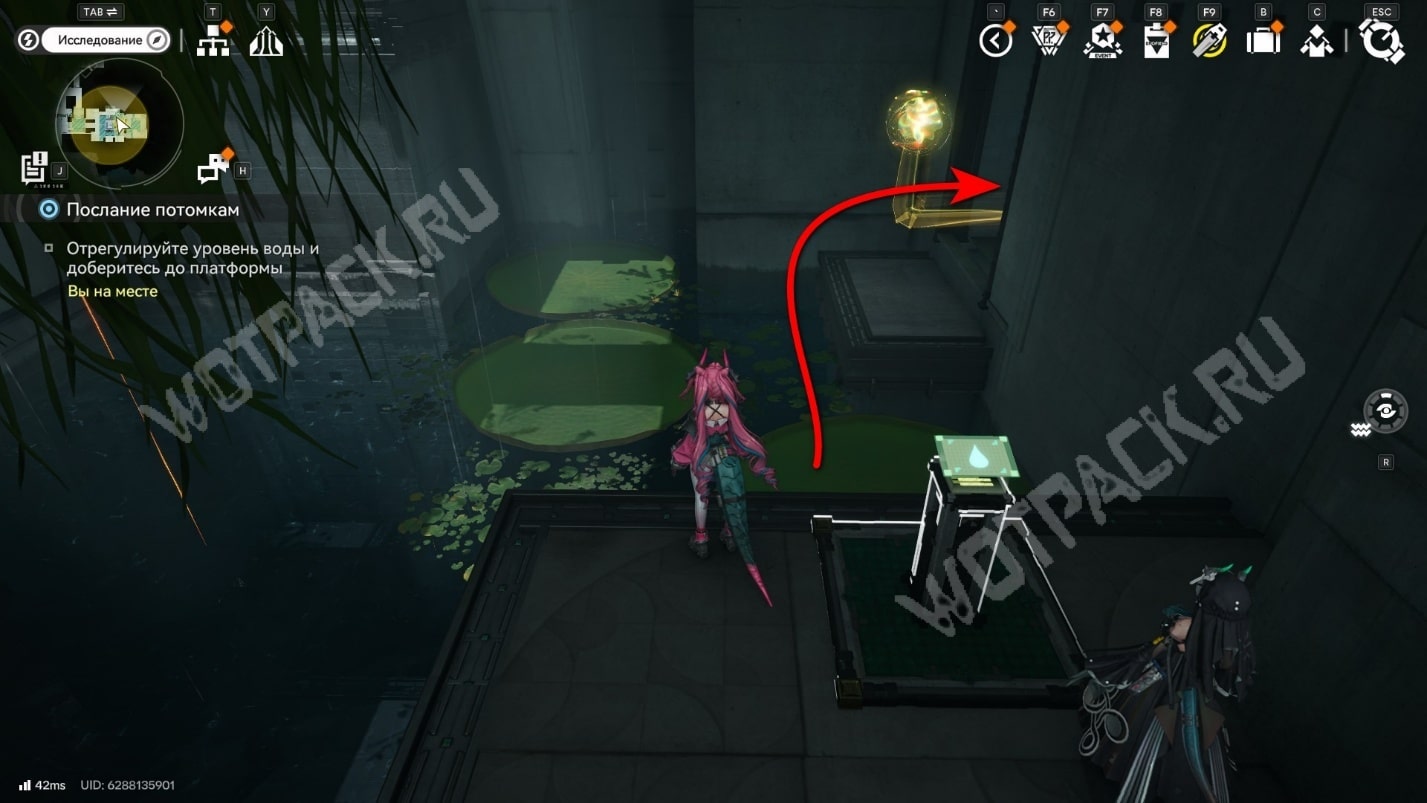 По кувшинкам пройдите в затопленную комнату, а затем — по лестнице к панели управления. Можно следовать за Ауриленом, который парит поблизости.