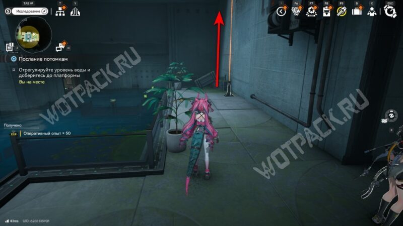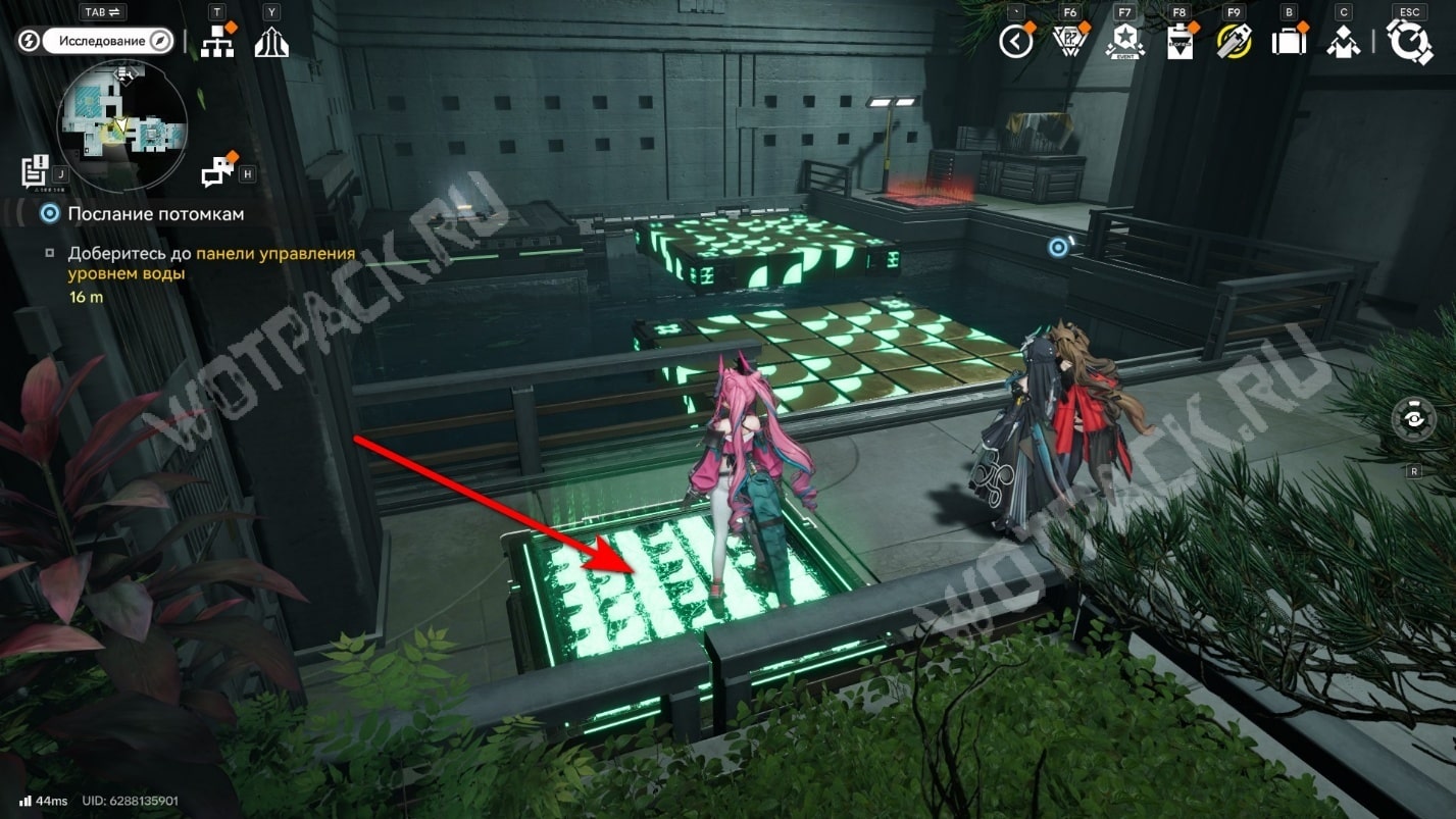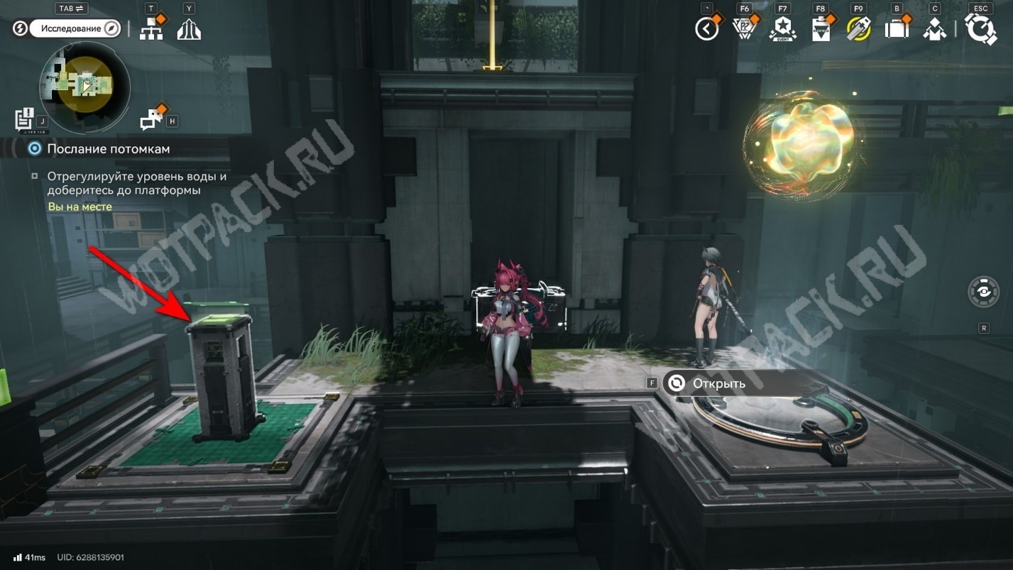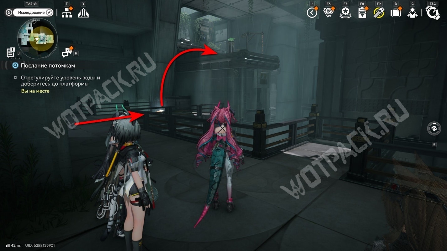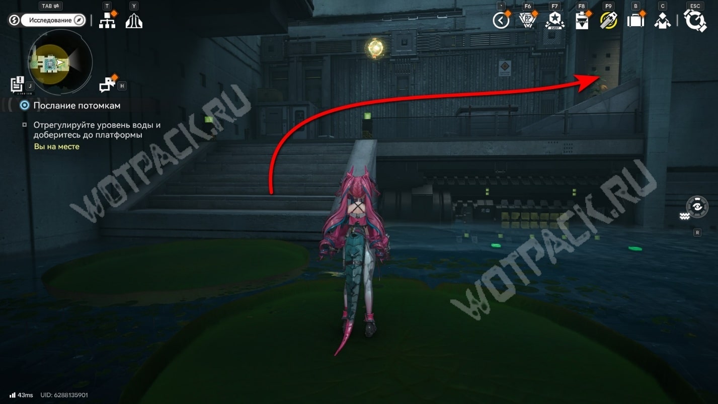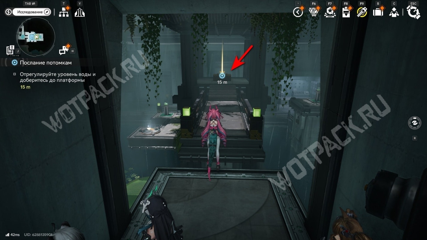 По кувшинкам пройдите в затопленную комнату, а затем — по лестнице к панели управления. Можно следовать за Ауриленом, который парит поблизости.