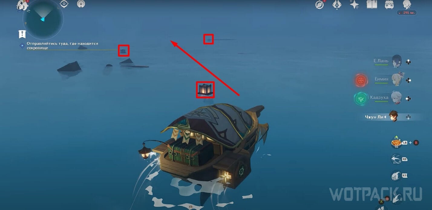В следующей зоне держите курс на север к острову с сокровищем, проплывая через препятствия, воронки и избегая урона от ударов молний.