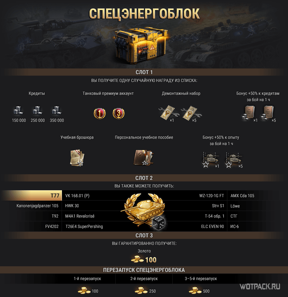 Помимо перечисленных уже энергоблоков еще будут лутбоксы за донат (ну куда уж без этого). Главная награда там — премиумный американский тяжелый танк Т77.