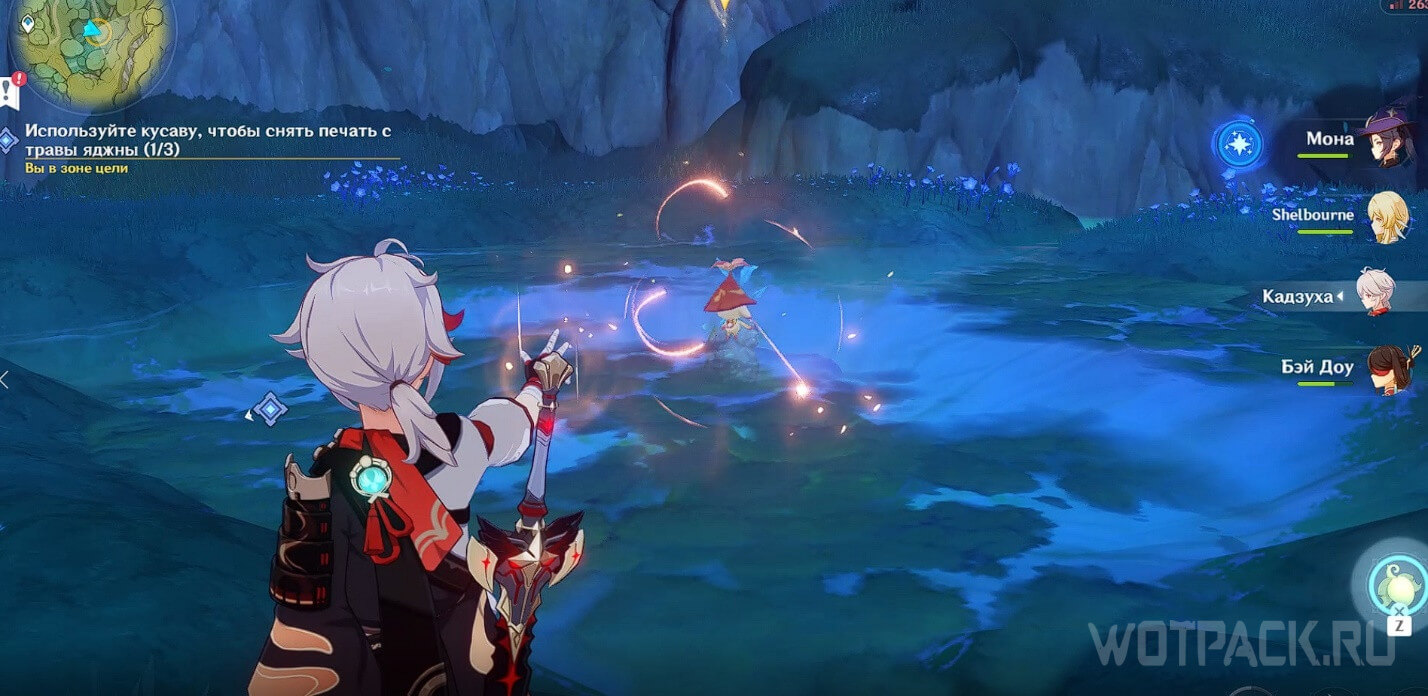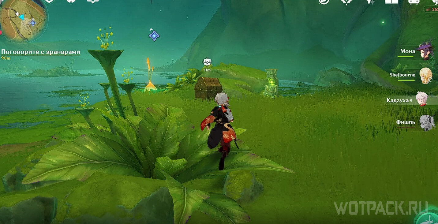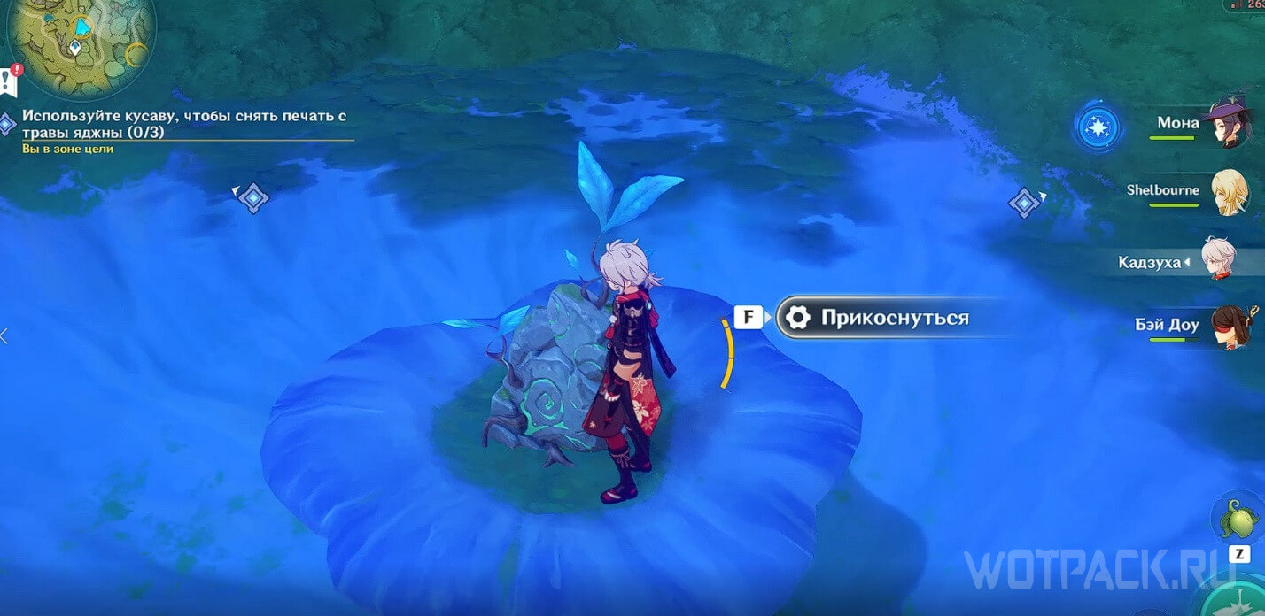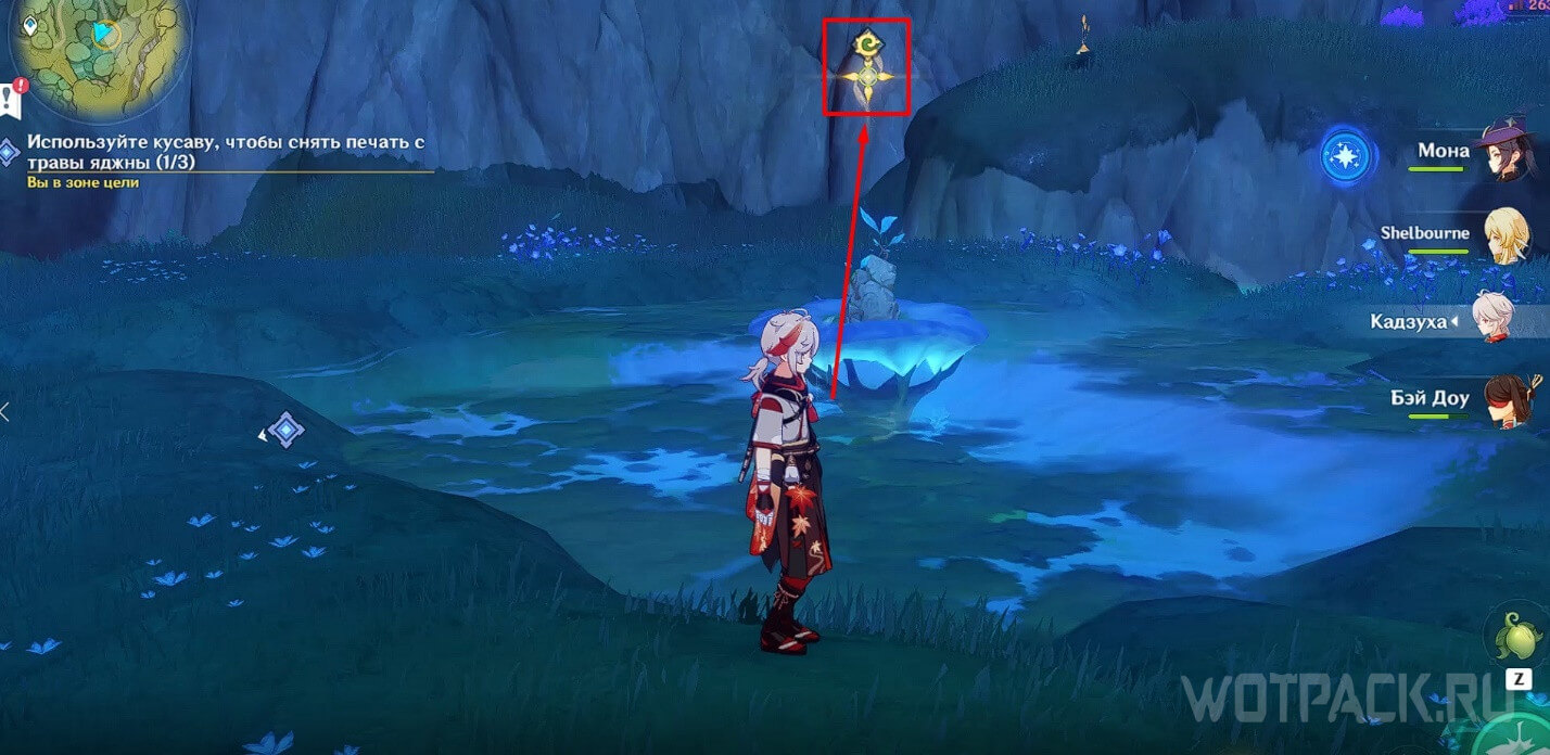 Переместитесь к телепорту рядом с цифрой «1» на скриншоте общей карты и пройдите немного вперед. Одолейте хиличурлов и используйте кусаву, чтобы поднять печать из-под воды.