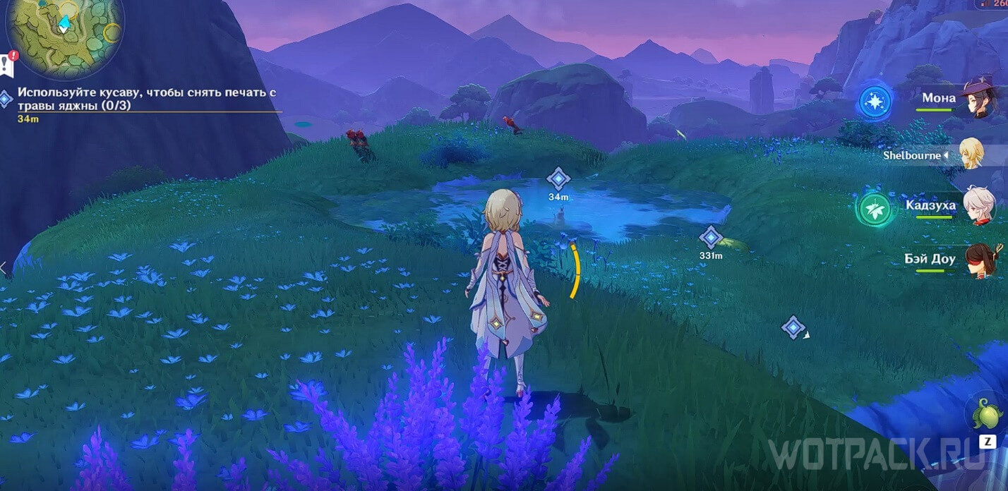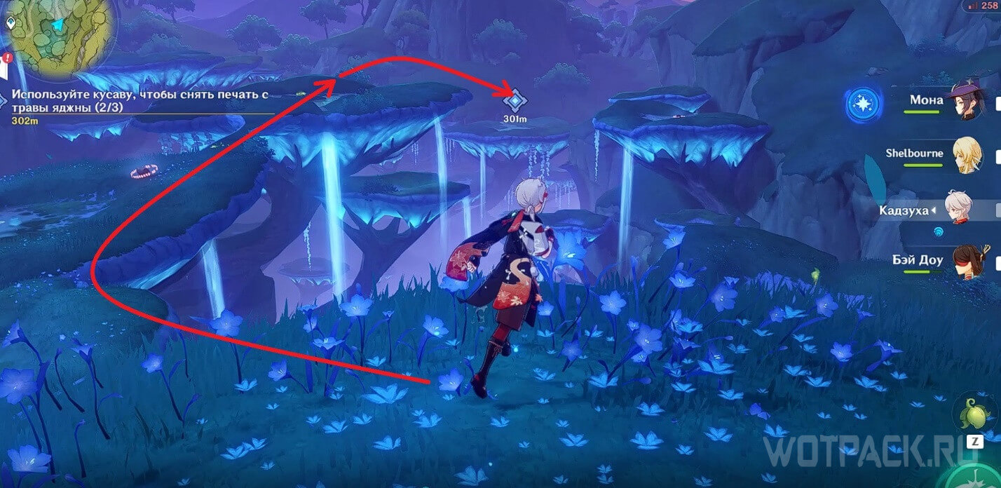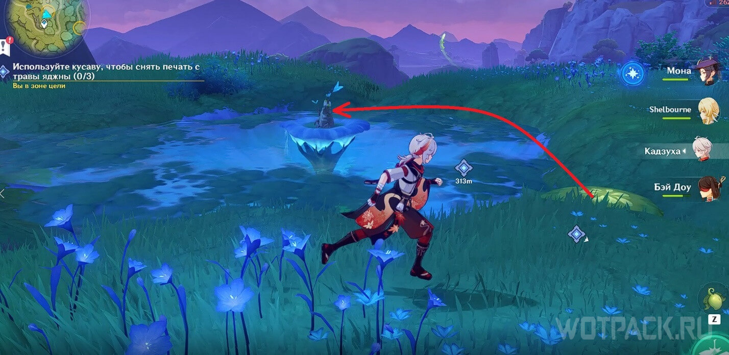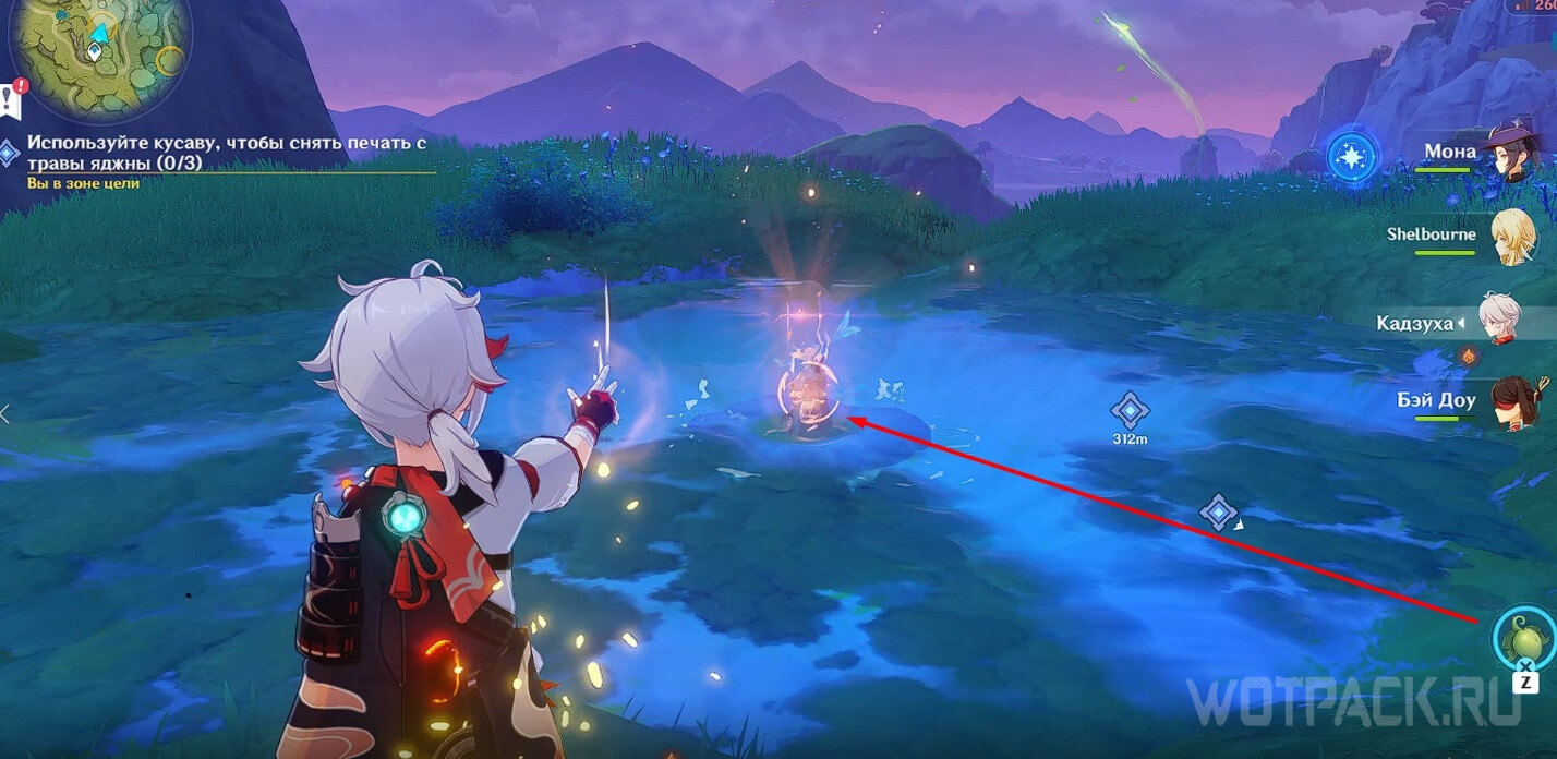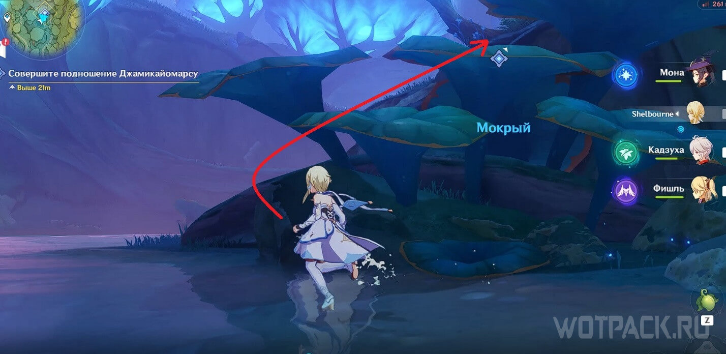 Переместитесь к телепорту рядом с цифрой «1» на скриншоте общей карты и пройдите немного вперед. Одолейте хиличурлов и используйте кусаву, чтобы поднять печать из-под воды.