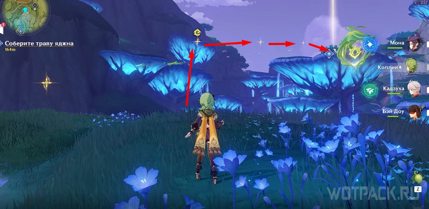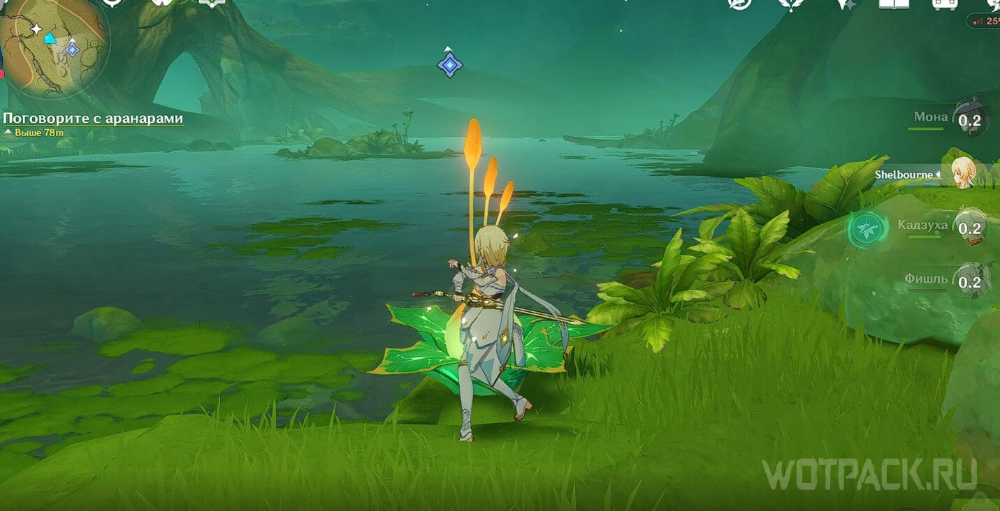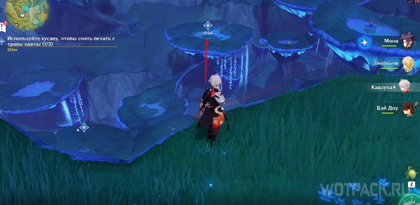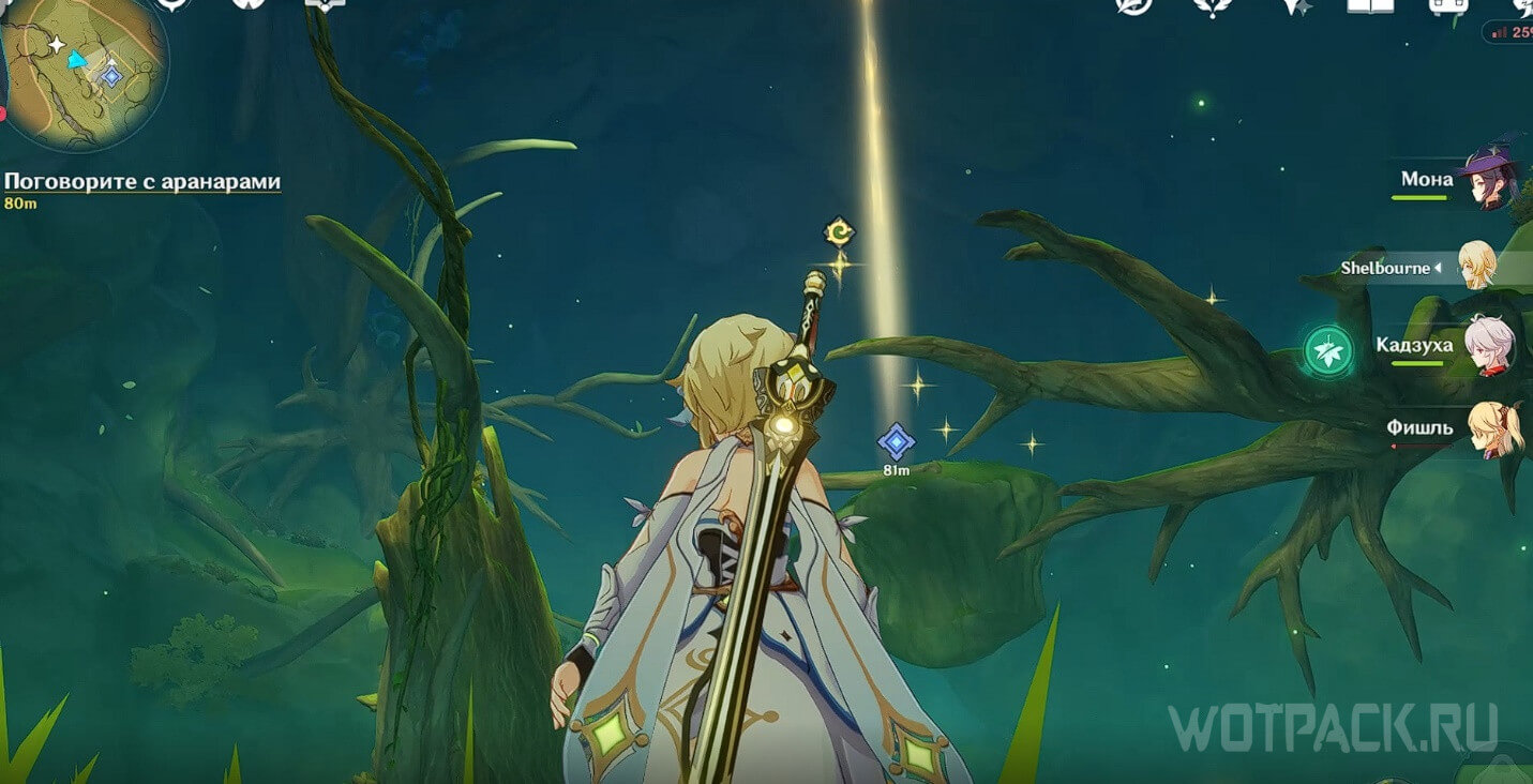 Примените Дендро элемент на тычинке в виде луковицы поблизости, чтобы появился четырехлистный символ. Телепортируйтесь с его помощью наверх.
