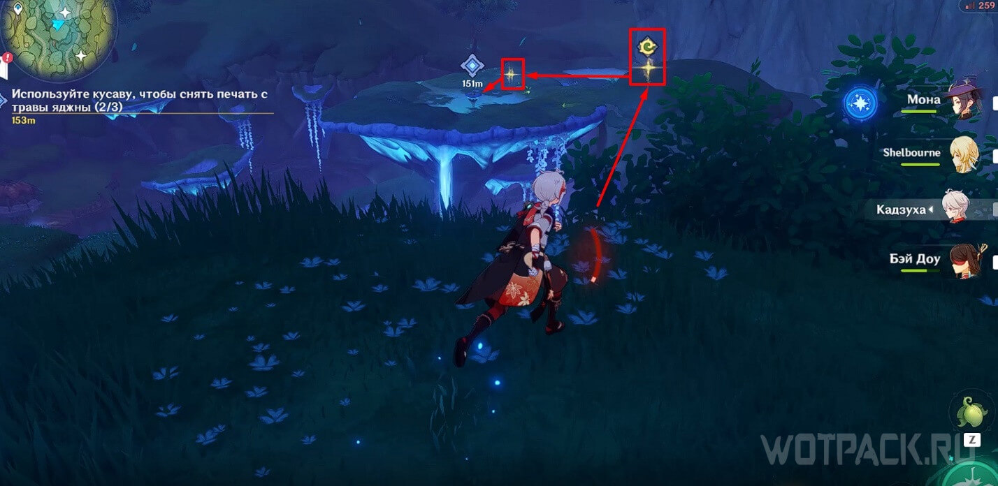 В лесу Мотийимы есть огромный гриб посередине. Севернее от него находится еще один крупный гриб с нужным входом. Для того чтобы туда добраться, используйте самый близкий к нему телепорт (слева у подножья горы). Затем парите до красной точки справа и запрыгните на гриб через четырехлистный символ. Как окажетесь наверху, пройдите вглубь к корням — там расположен обрыв со входом в пещеру.