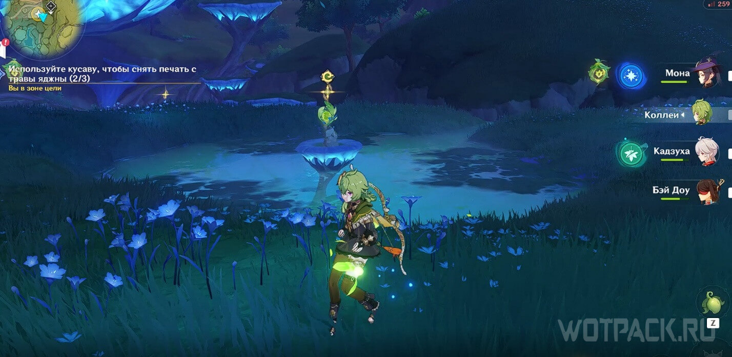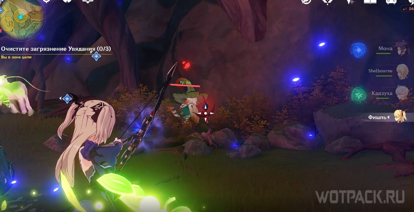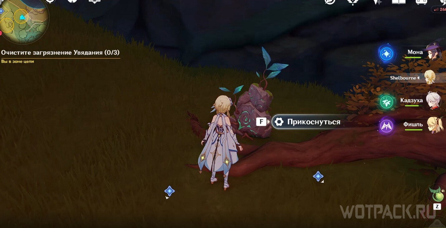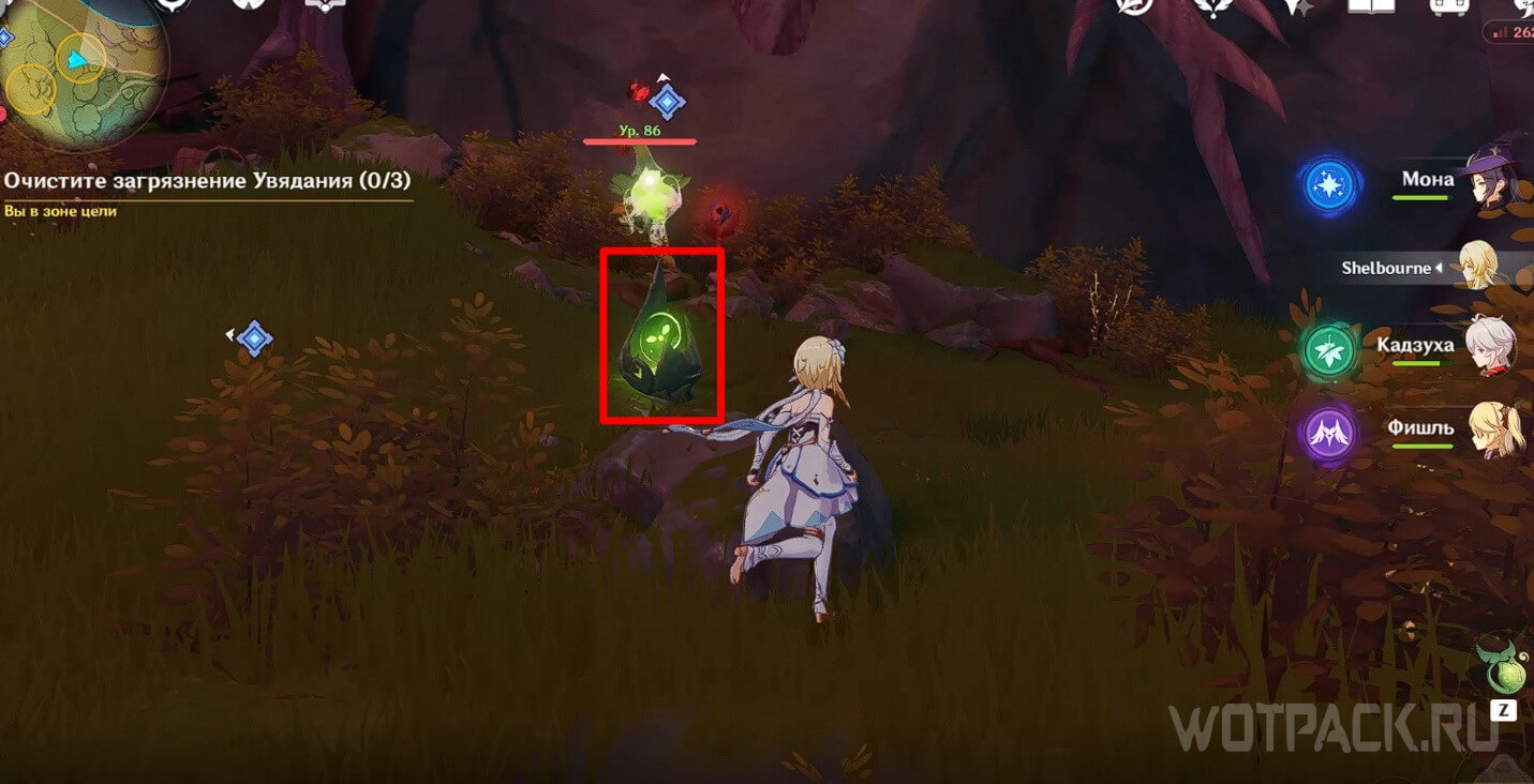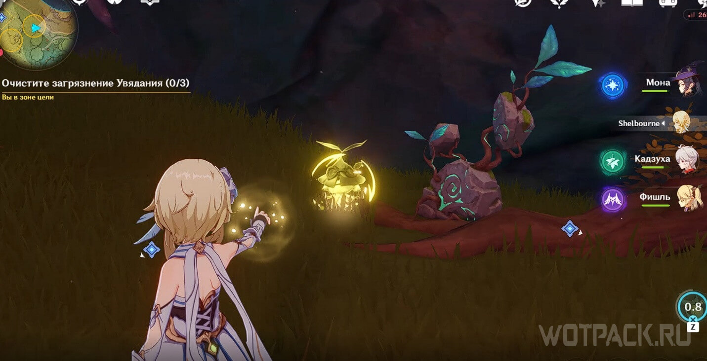- В конце призовите дендрогранум и атакуйте заряженной атакой или прицельным выстрелом по красной увядающей ветке поблизости, чтобы очистить загрязнение.