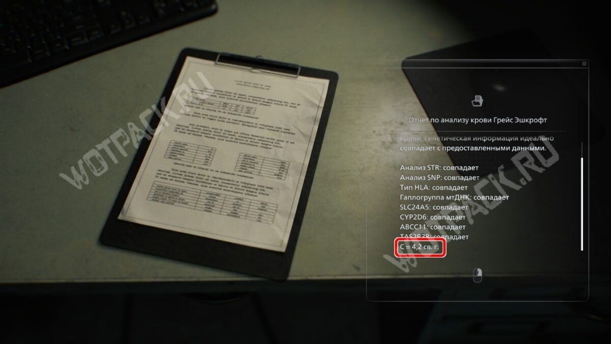 На тайной исследовательской базе Гидеона под двором медцентра на этапе поиска ключей от вертолёта можно наткнуться на следующую подсказку. В комнате Частная лаборатория на столе лежит отчёт по анализу крови Грейс Эшкрофт.