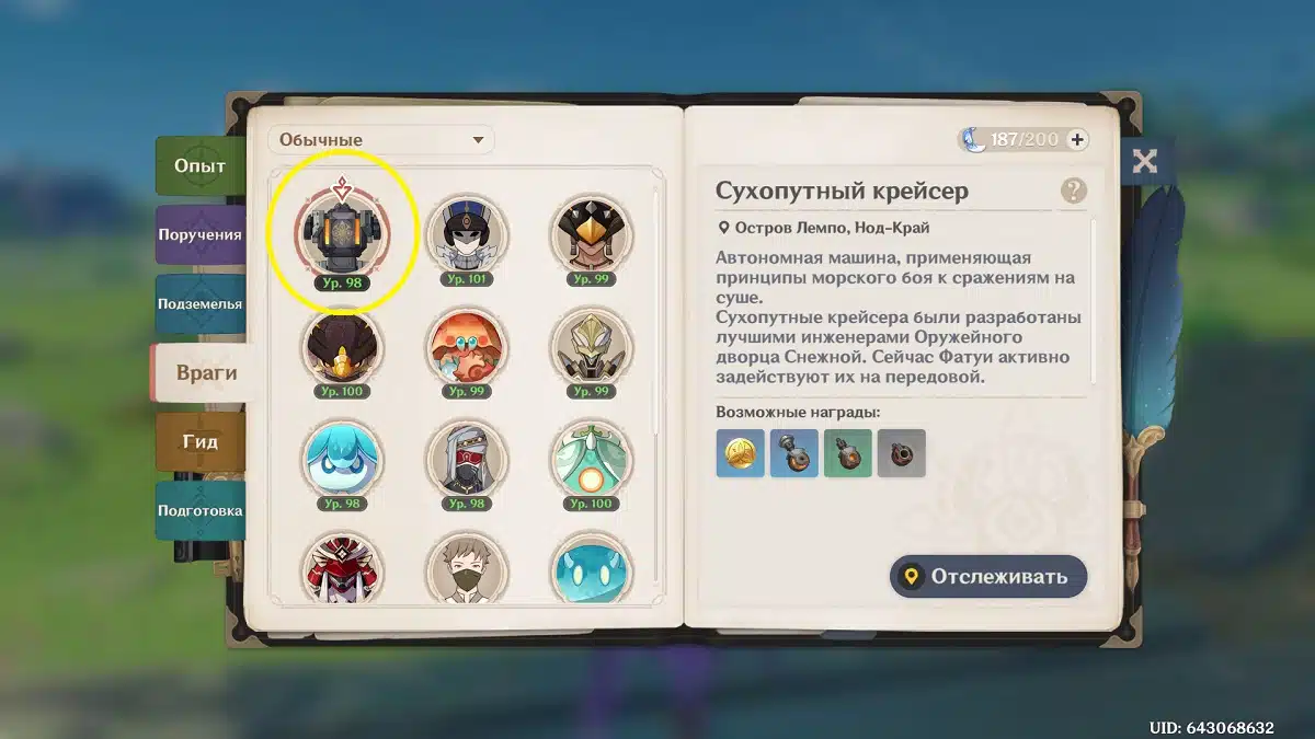 - Сломанный/усиленный/высокоточный вал фармится с Сухопутных крейсеров, являющихся обычными врагами в Лунном регионе. Боевые машины Фатуи встречаются в основном на их острове в окрестностях Конструкторского бюро, но при этом отдельные группы попадаются и на других островах.