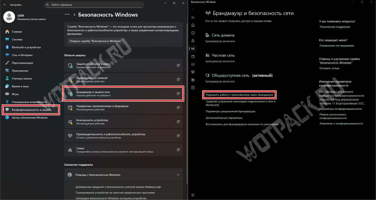 - Windows 11: Параметры → Конфиденциальность и защита → Безопасность → Брандмауэр и безопасность → Разрешить работу с приложением через брандмауэр.