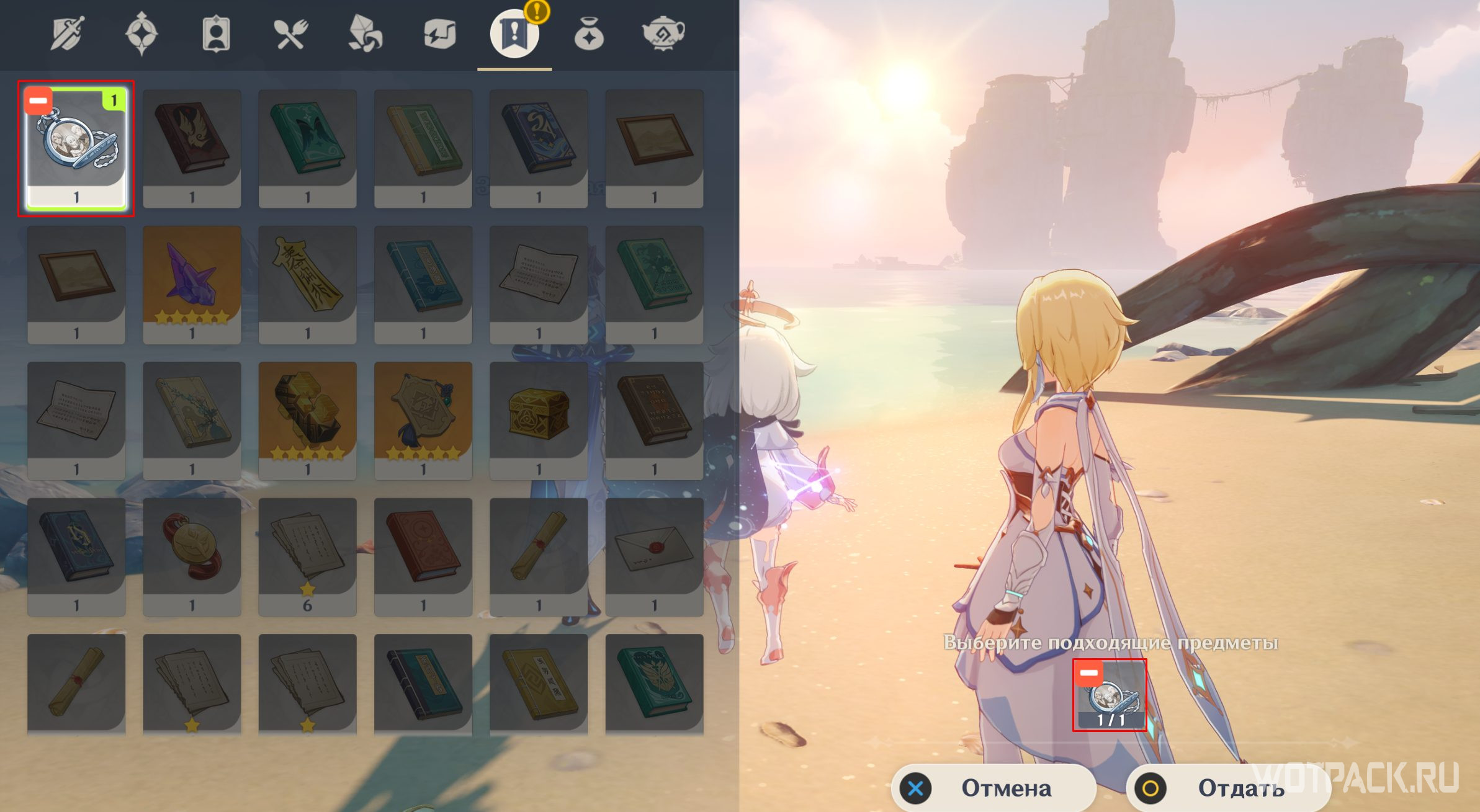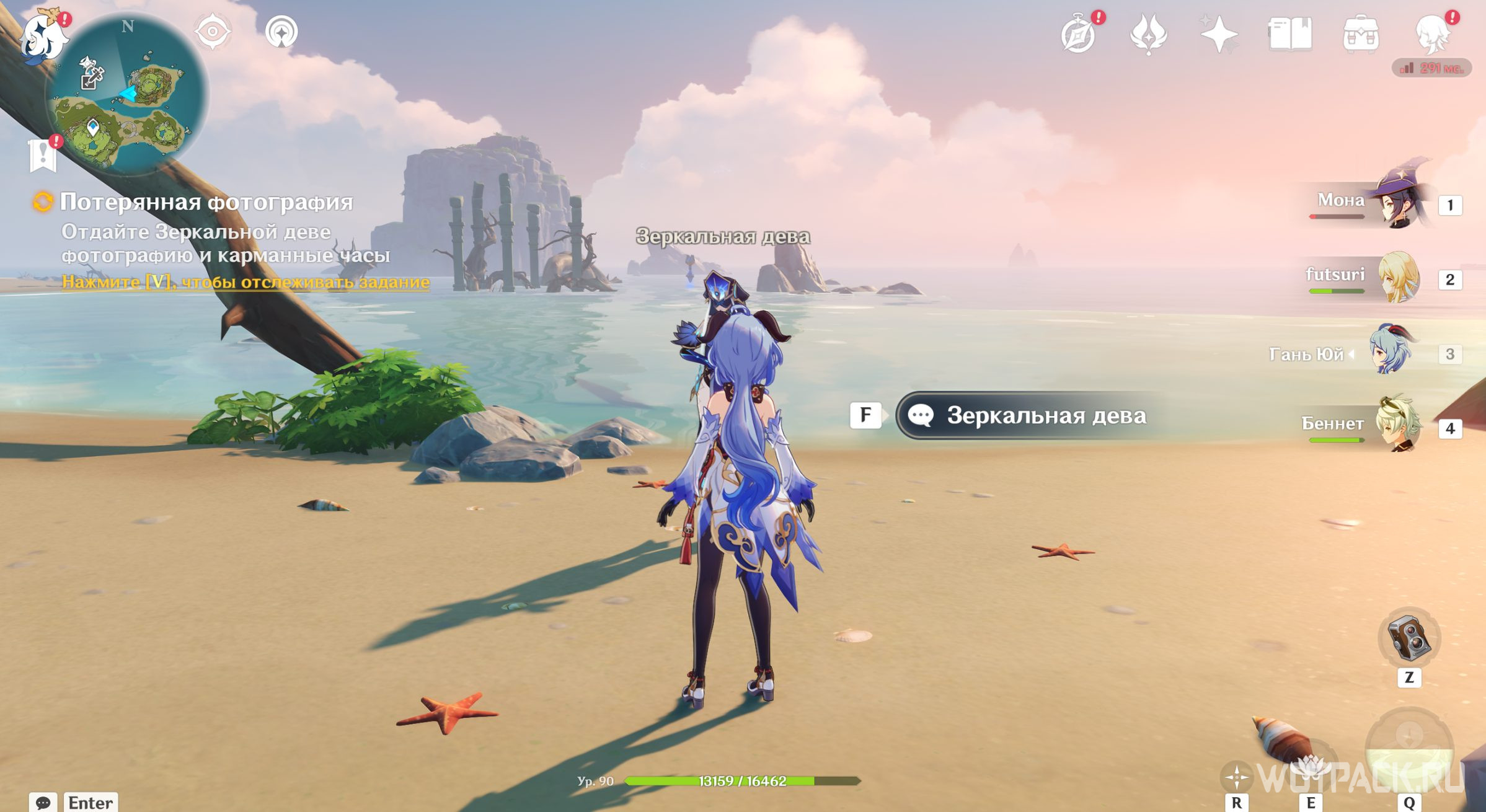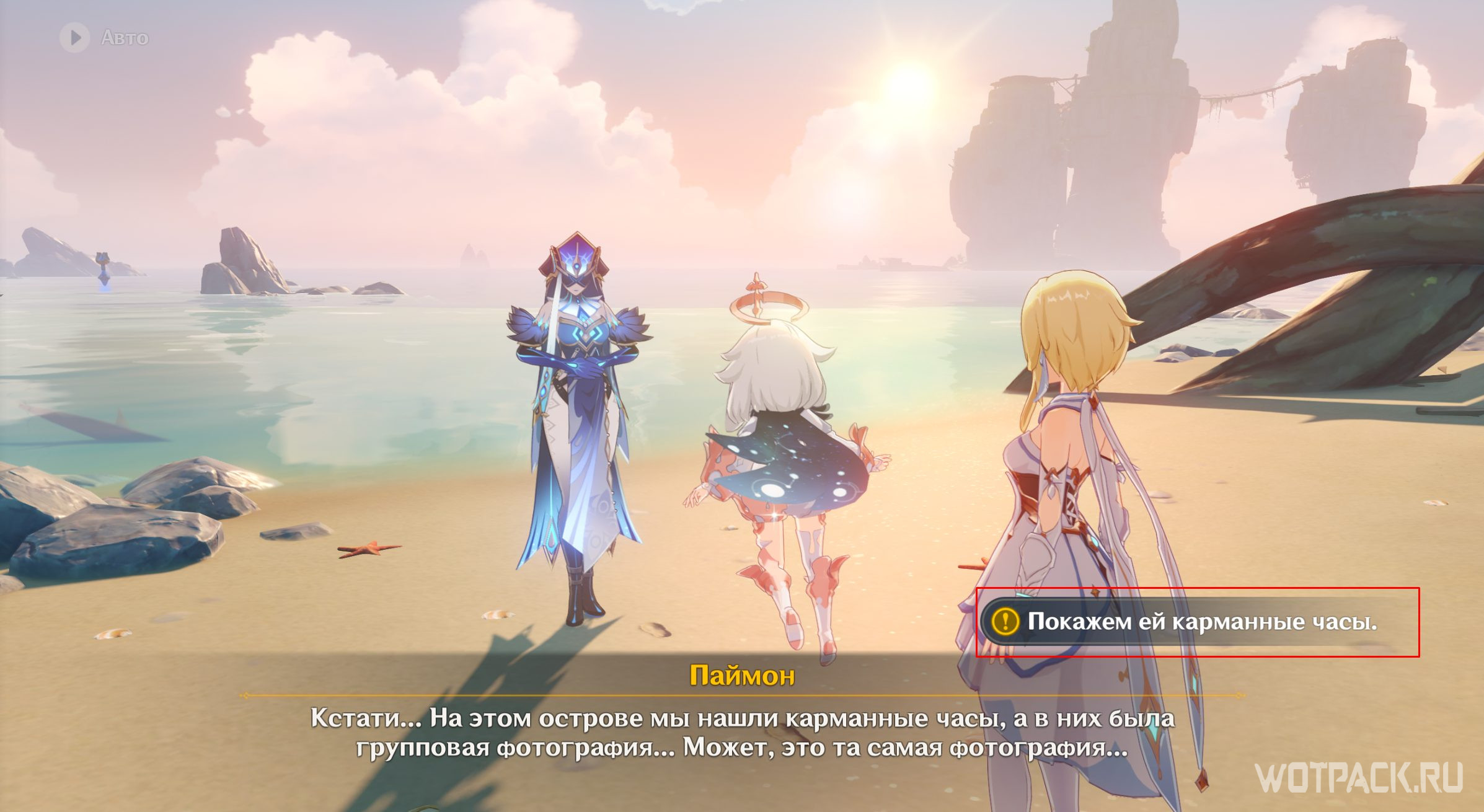 Вернитесь к месту на побережье, где стоит Фатуи, чтобы отдать Зеркальной деве фотографию и карманные часы. Начните с ней разговор и выберите опцию «Покажем ей карманные часы». В Инвентаре нажмите на нужный предмет и подтвердите передачу.