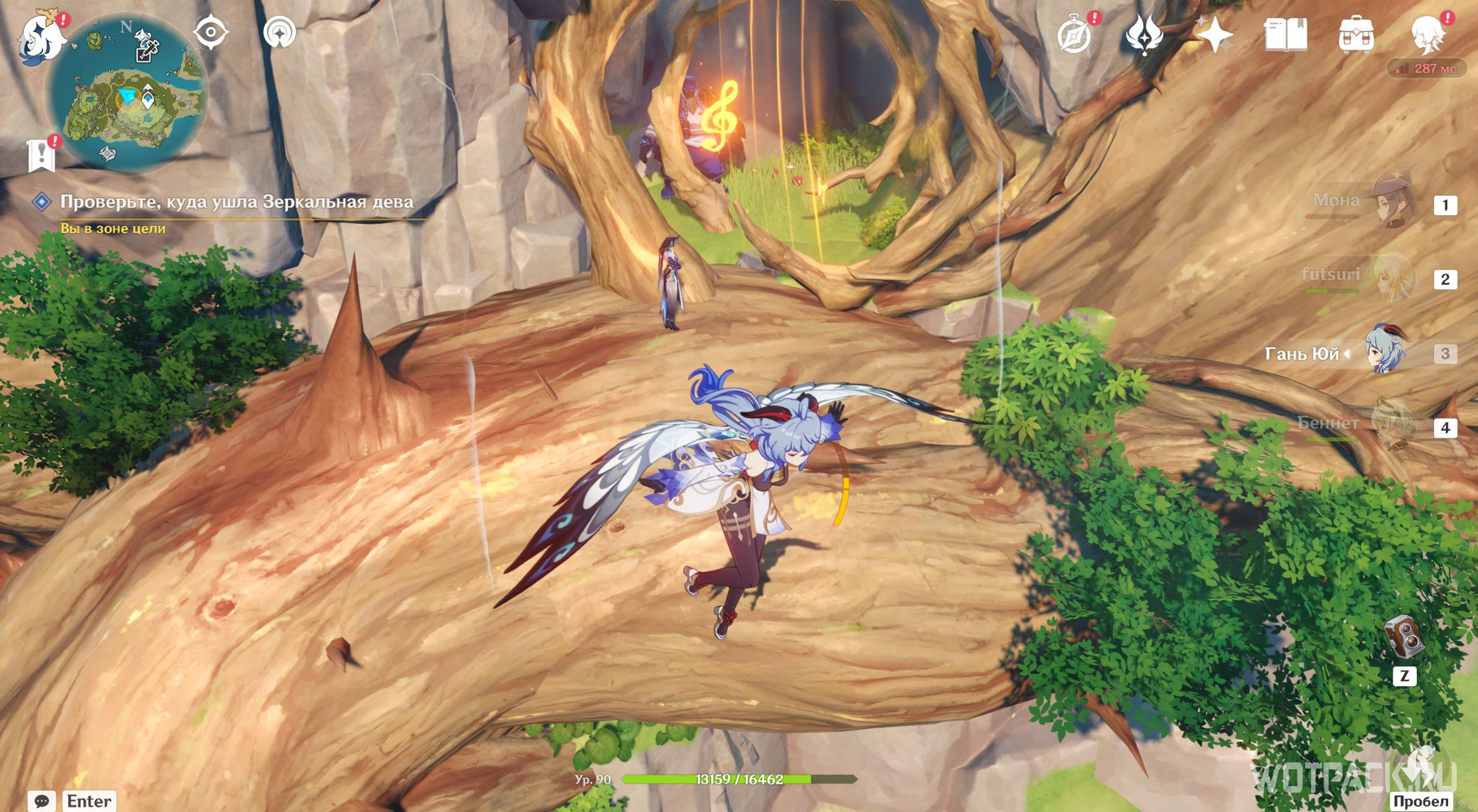 Фатуи ушла искать Захара. Чтобы найти девушку, необходимо переместиться на телепорт на вершине, а затем спуститься на корень, расположенный на северо-востоке. Рядом с пещерой, закрытой при помощи музыкального барьера, и стоит Зеркальная дева.