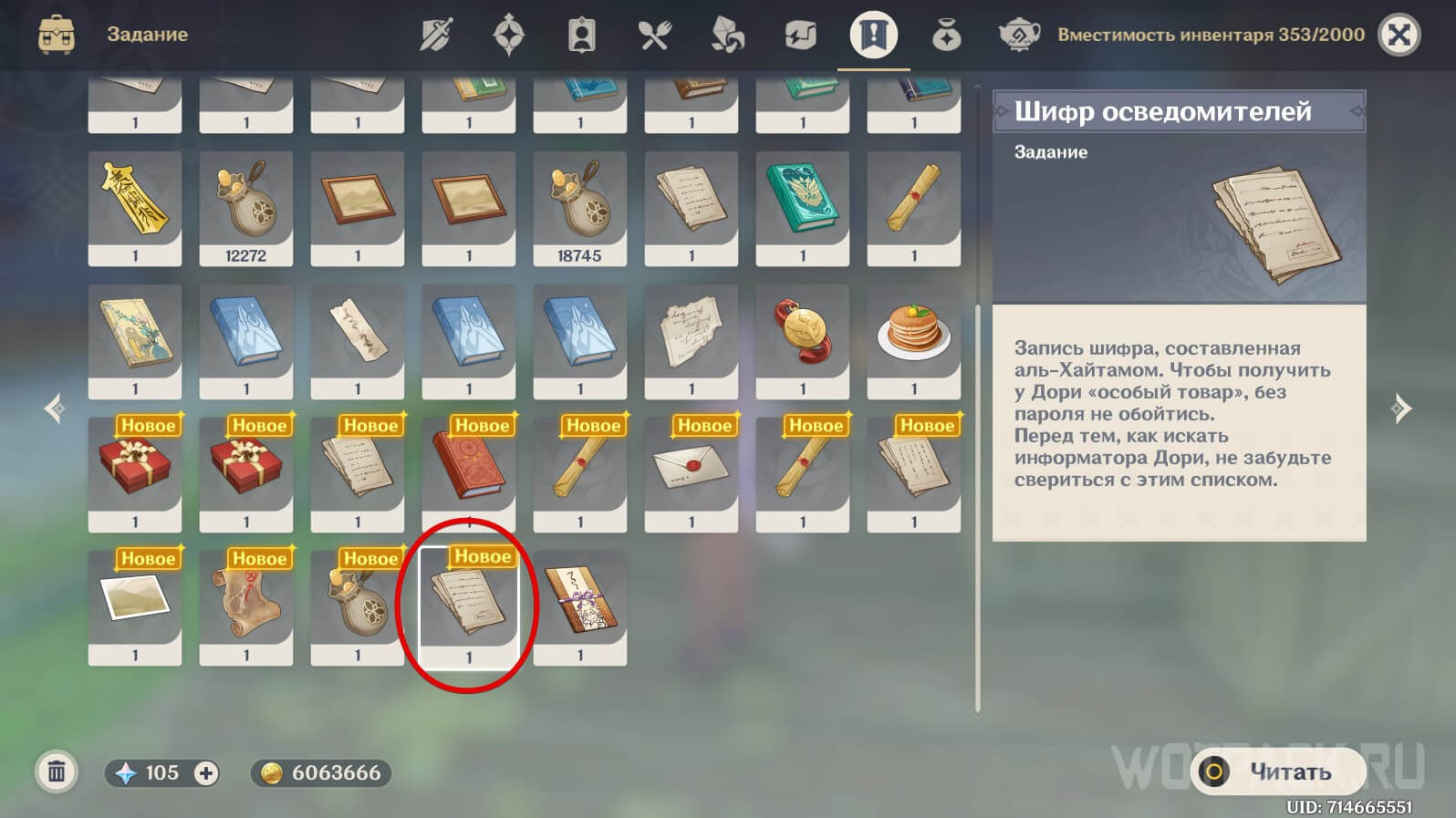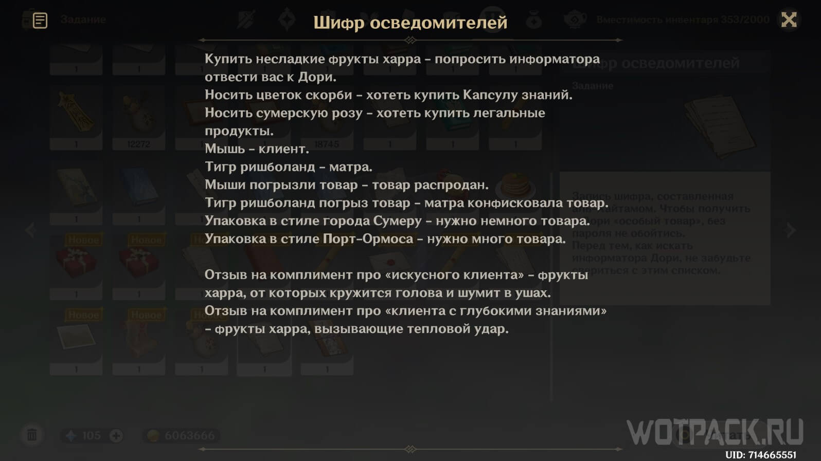 Аль-Хайтам даст адрес информатора Дори и список шифров. Изучите его: нажмите на кнопку «B» и найдите Шифр осведомителей в списке предметов для заданий, чтобы знать, что нужно сказать НПС. Либо воспользуйтесь готовым списком реплик.