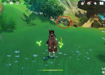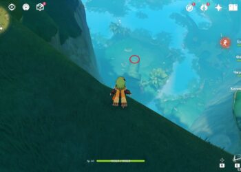 От Статуи Архонта в Горах Девантаки развернитесь и бегите вправо. Спрыгните с обрыва на круглый камень в форме выпуклой гайки – рядом находится группа хиличурлов, а нужное место подсвечивается звездочкой.