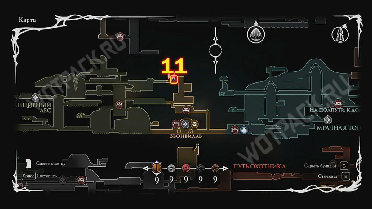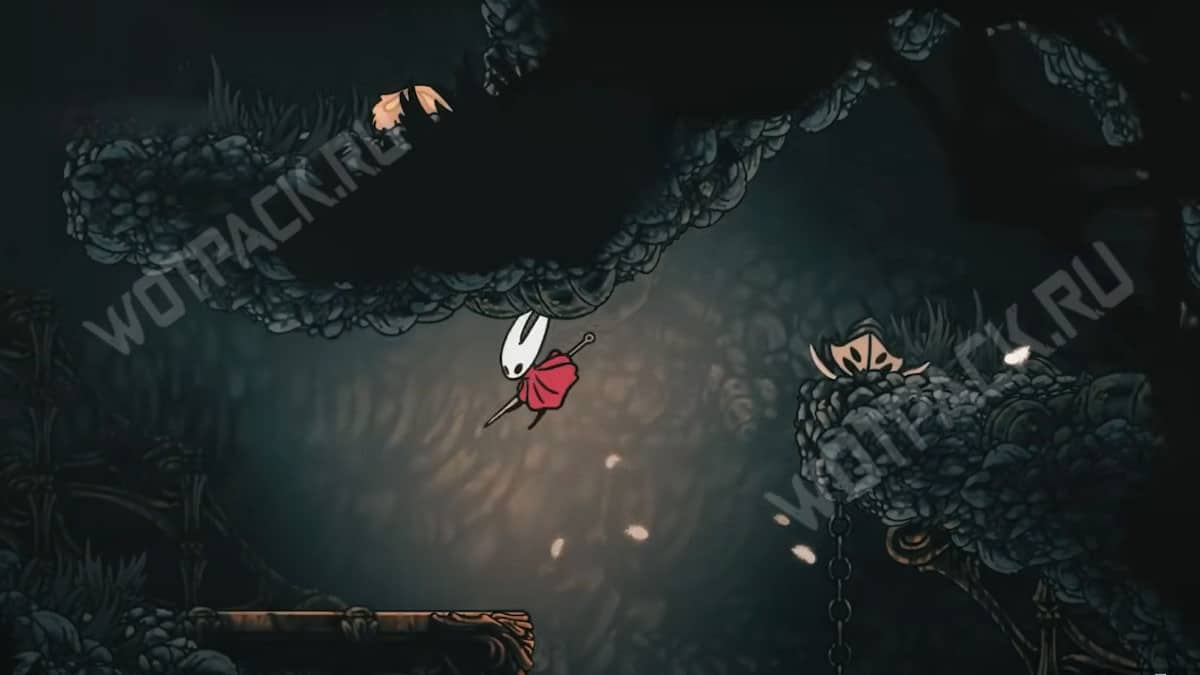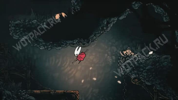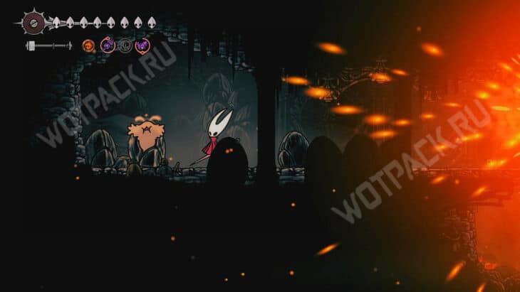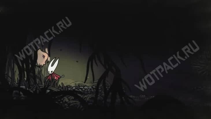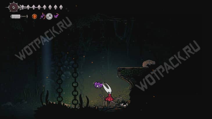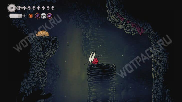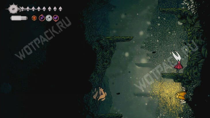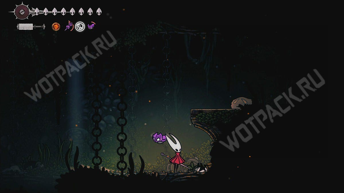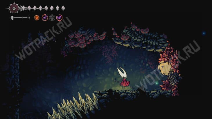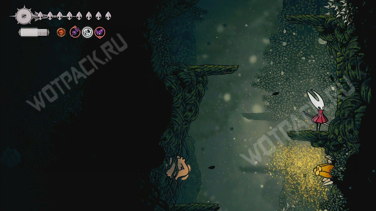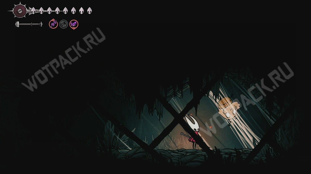 На Пути охотника основную опасность представляют красные бутоны и поля шипов под ними — преодолеть их проще со знаком Жнеца. Чтобы найти заблудшего летуна, придется сразить мини-босса Скарр-стража, добраться до высокой пещеры и допрыгать по цветкам до правого верхнего угла.