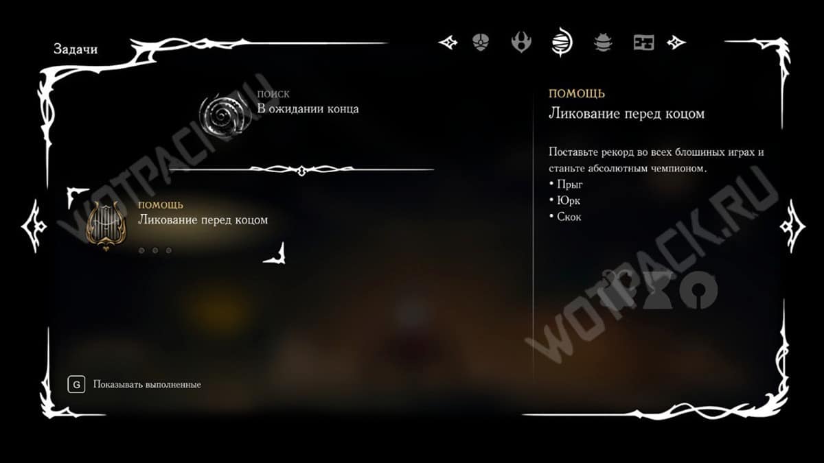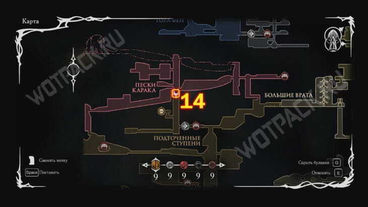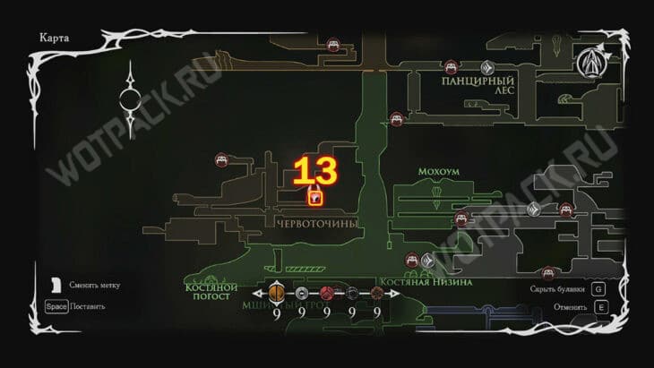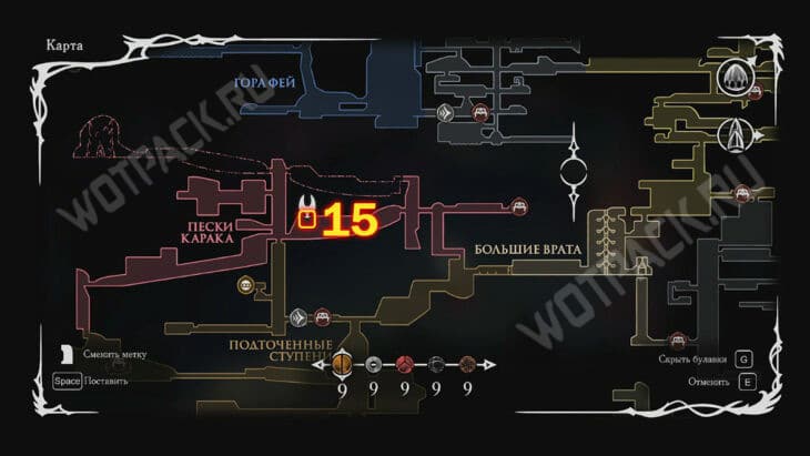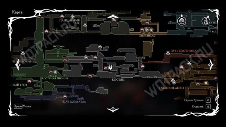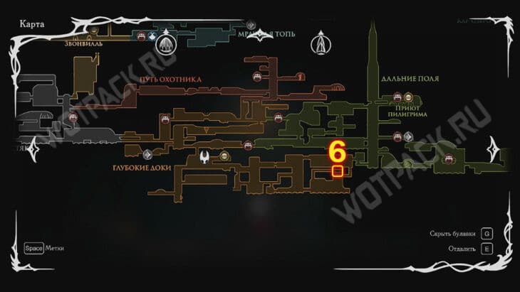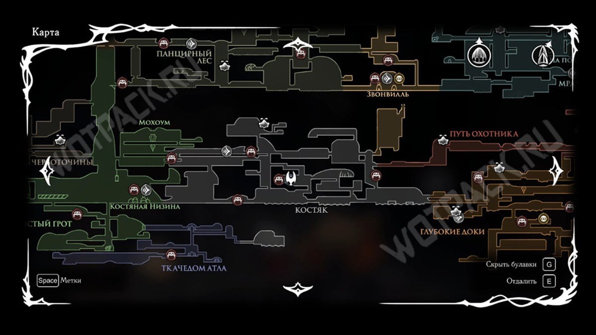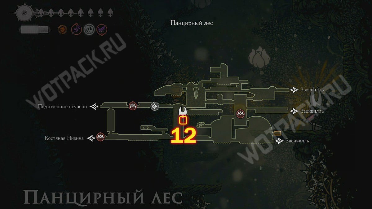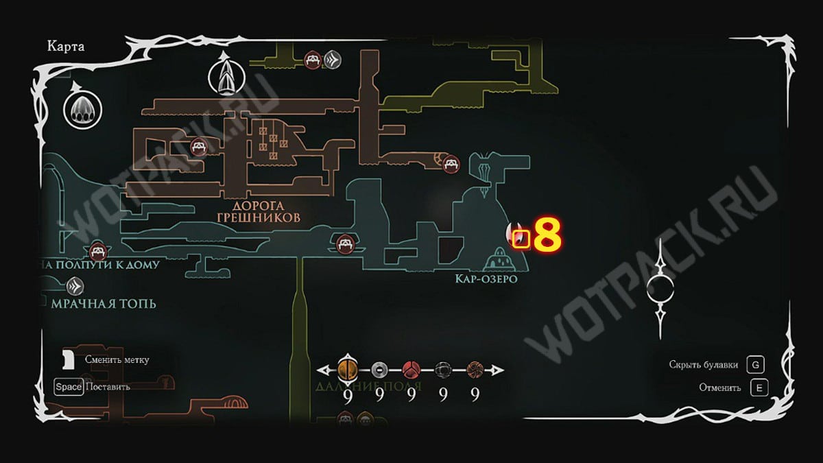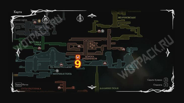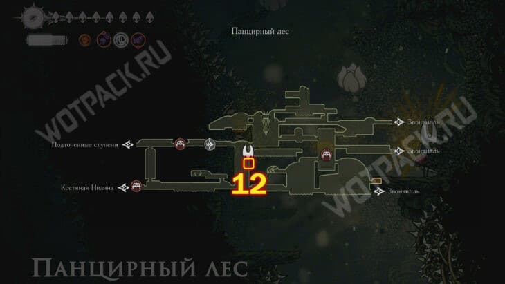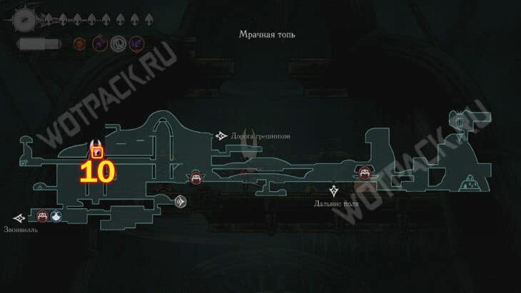 На Пути охотника основную опасность представляют красные бутоны и поля шипов под ними — преодолеть их проще со знаком Жнеца. Чтобы найти заблудшего летуна, придется сразить мини-босса Скарр-стража, добраться до высокой пещеры и допрыгать по цветкам до правого верхнего угла.