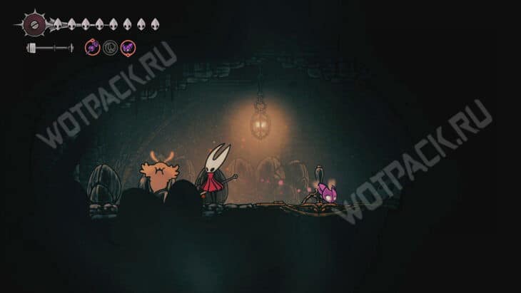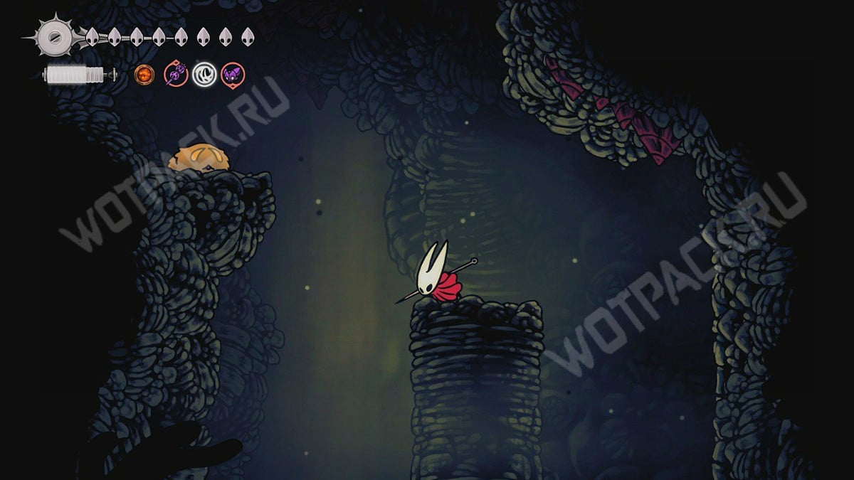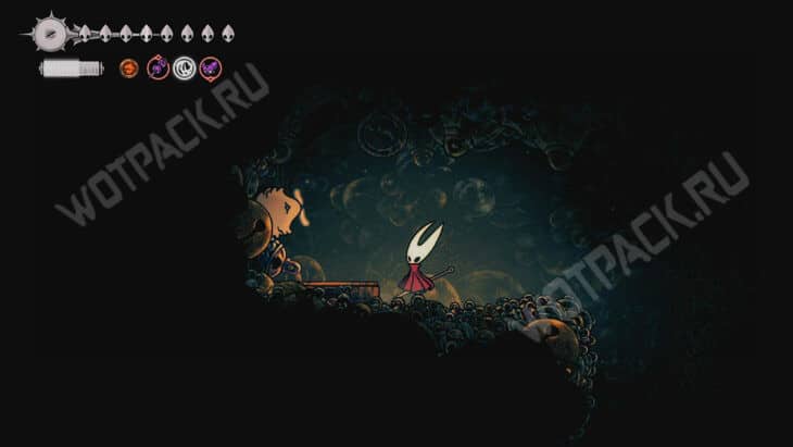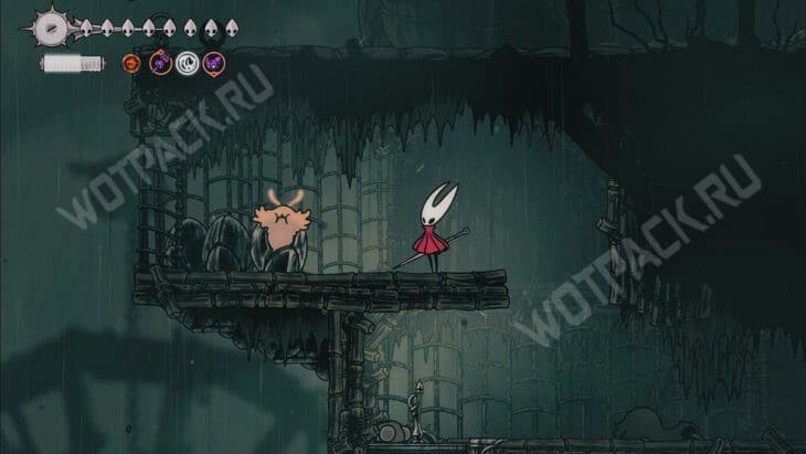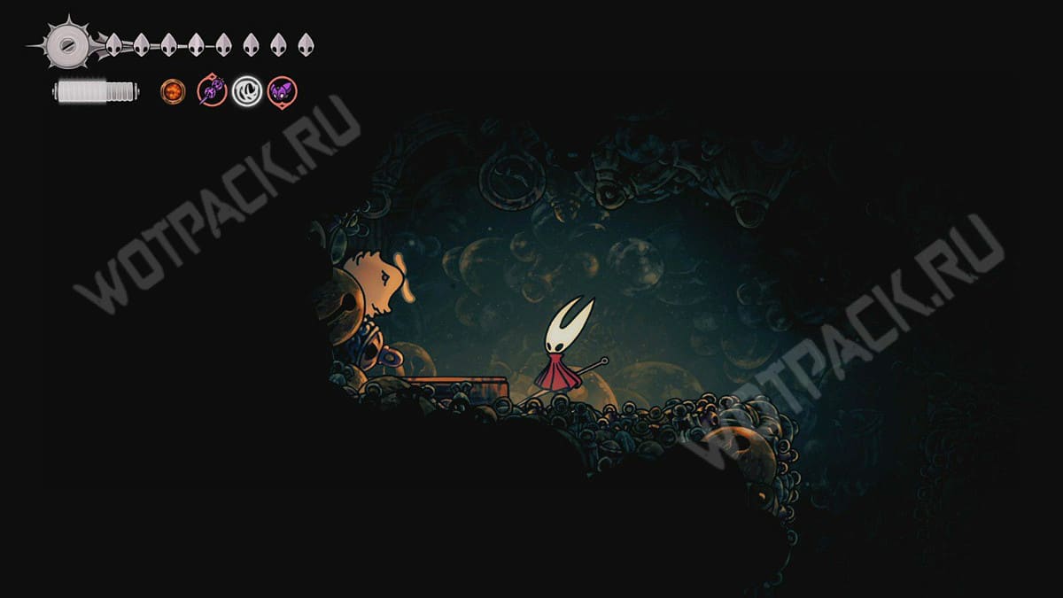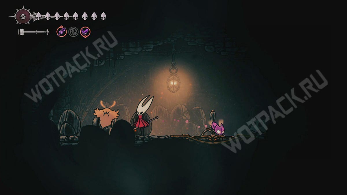 От местной таверны пройдите к левому лифту, чтобы очутиться на платформе, рядом с которой парит большой воздушный шар. Продолжайте восхождение, пока не обнаружите стенку, что можно сломать. Разблокированная дорога приведет к месту, где находится Кратт: разбейте паутину, и после высвобождения бедолаги Хорнет сможет принимать целебную ванну в салоне каравана.