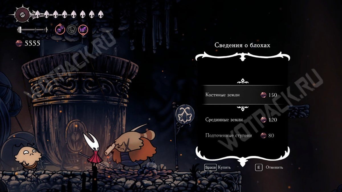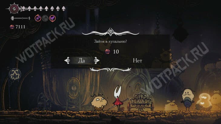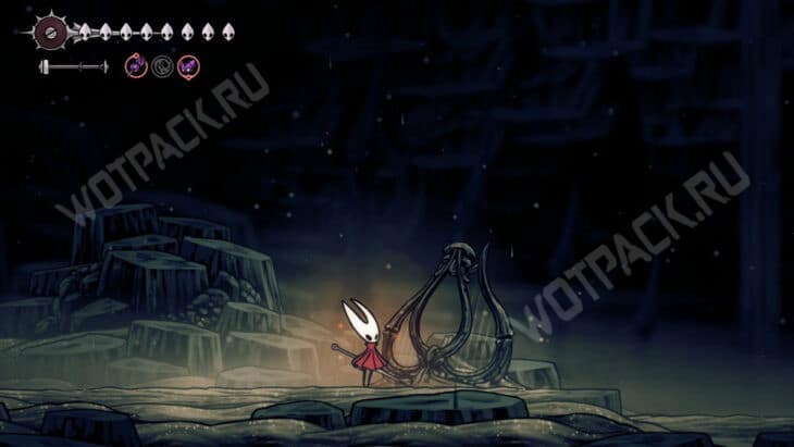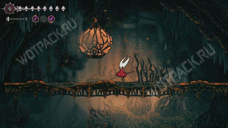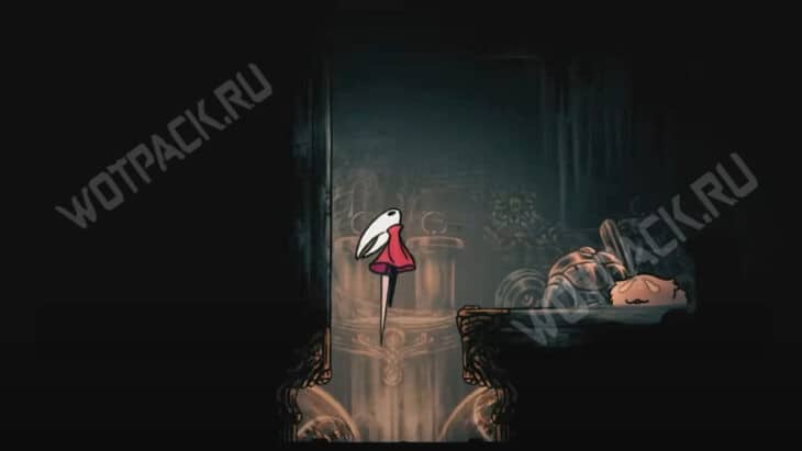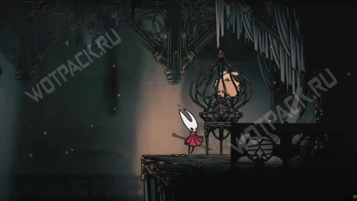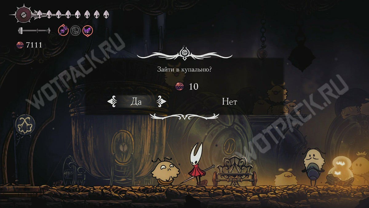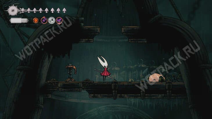 От местной таверны пройдите к левому лифту, чтобы очутиться на платформе, рядом с которой парит большой воздушный шар. Продолжайте восхождение, пока не обнаружите стенку, что можно сломать. Разблокированная дорога приведет к месту, где находится Кратт: разбейте паутину, и после высвобождения бедолаги Хорнет сможет принимать целебную ванну в салоне каравана.