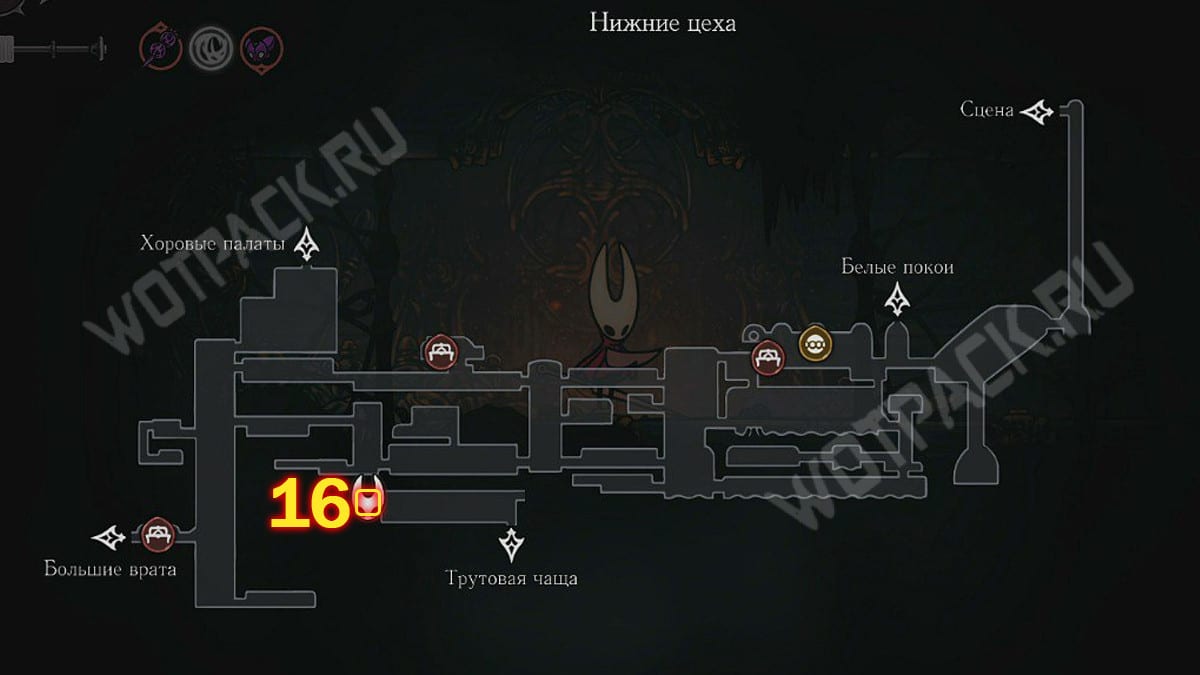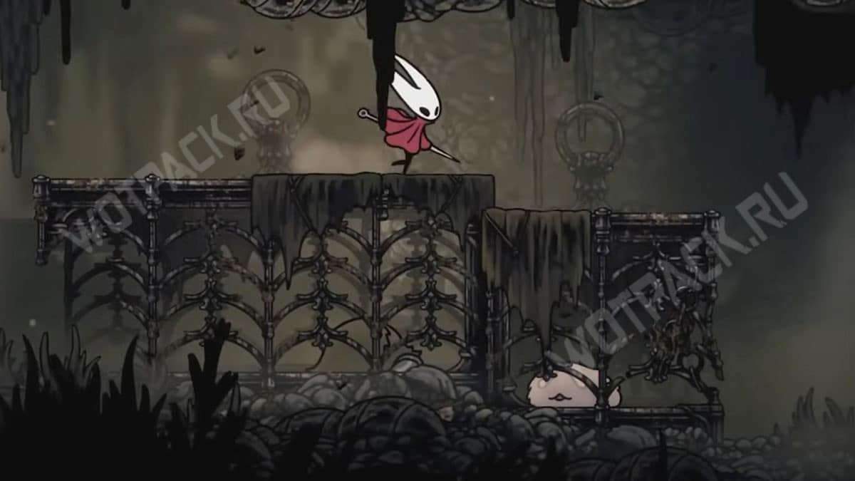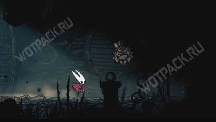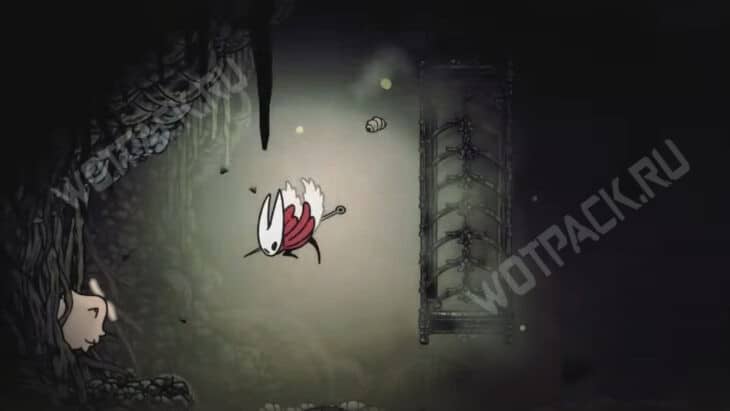 На востоке Хоровых палат находится город с мирными НПС — оттуда ступайте к правой пещере. Перескакивайте по горизонтальным металлическим площадкам над шипами и устраняйте встречных противников. Используя крайнюю стену, взберитесь повыше и по кольцам переберитесь к вертикальным платформам, над которыми будет закуток с испуганной букашкой.