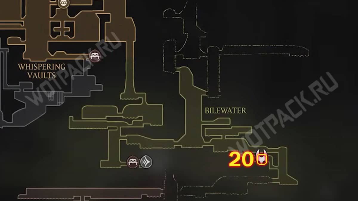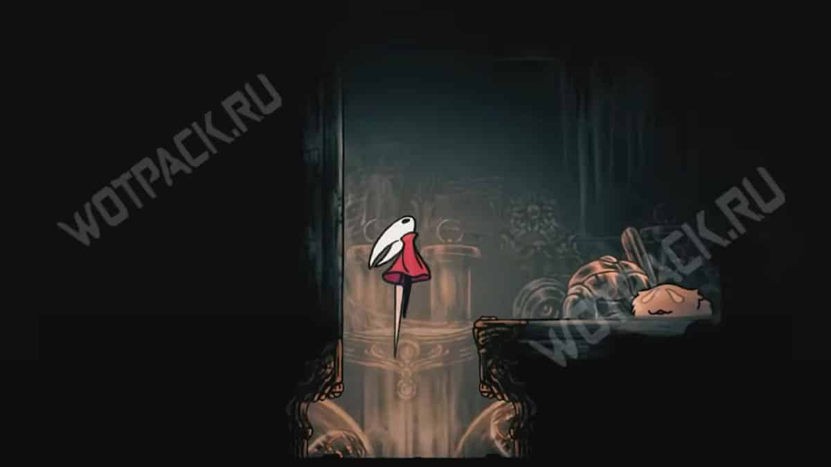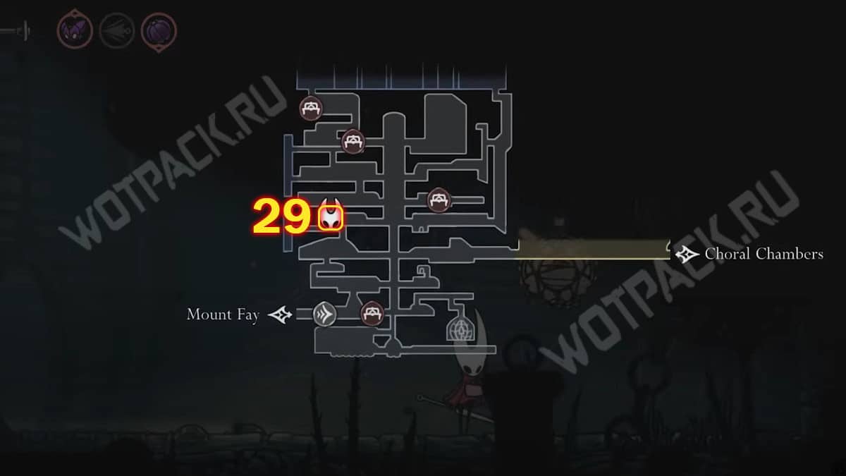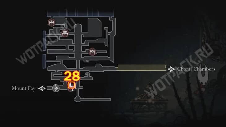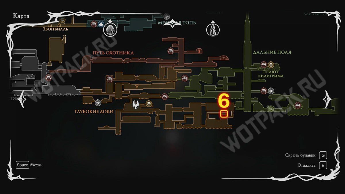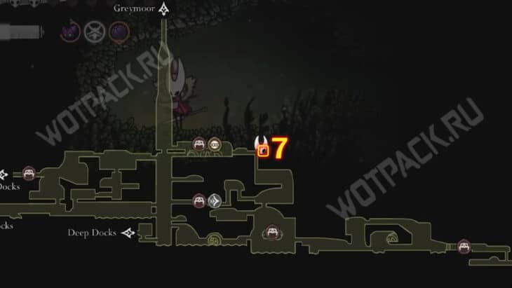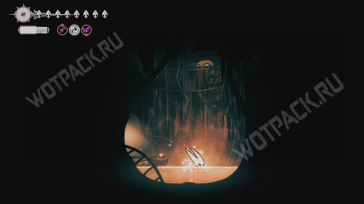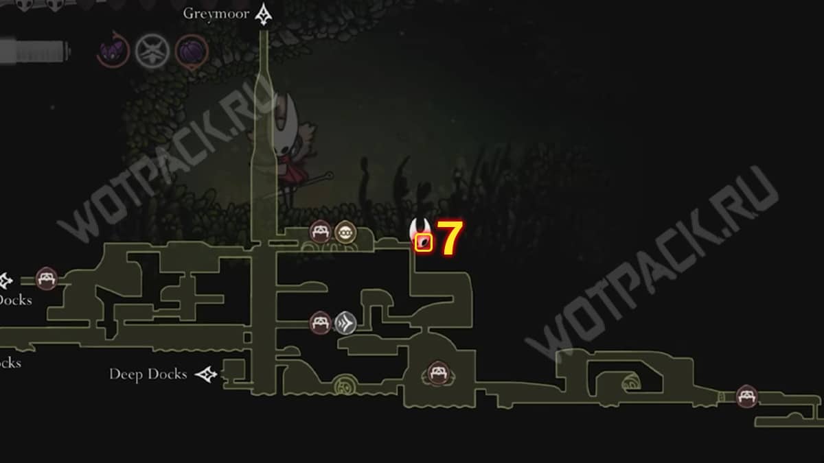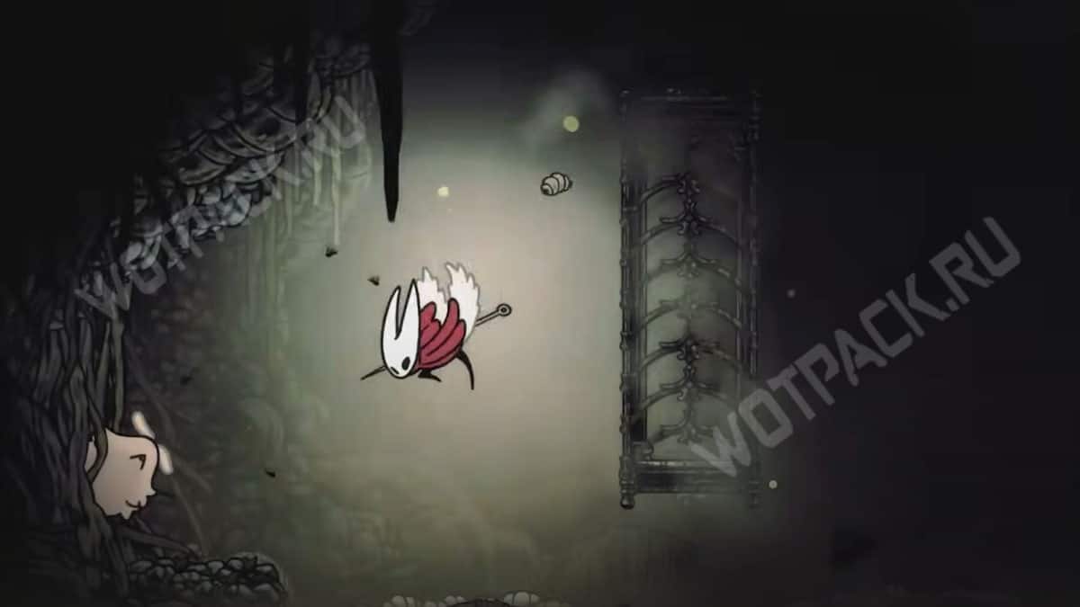 Возвращайтесь в Дальние поля после разблокировки цепкого захвата и удобного знака. Подъем к тайной комнате начинается в нижней части Глубоких доков в лабиринте, состоящем из красных шипов и воздушных потоков. В конечной пещере победите большого рогатого жука и проникните к крохе через восточный лаз в углу.