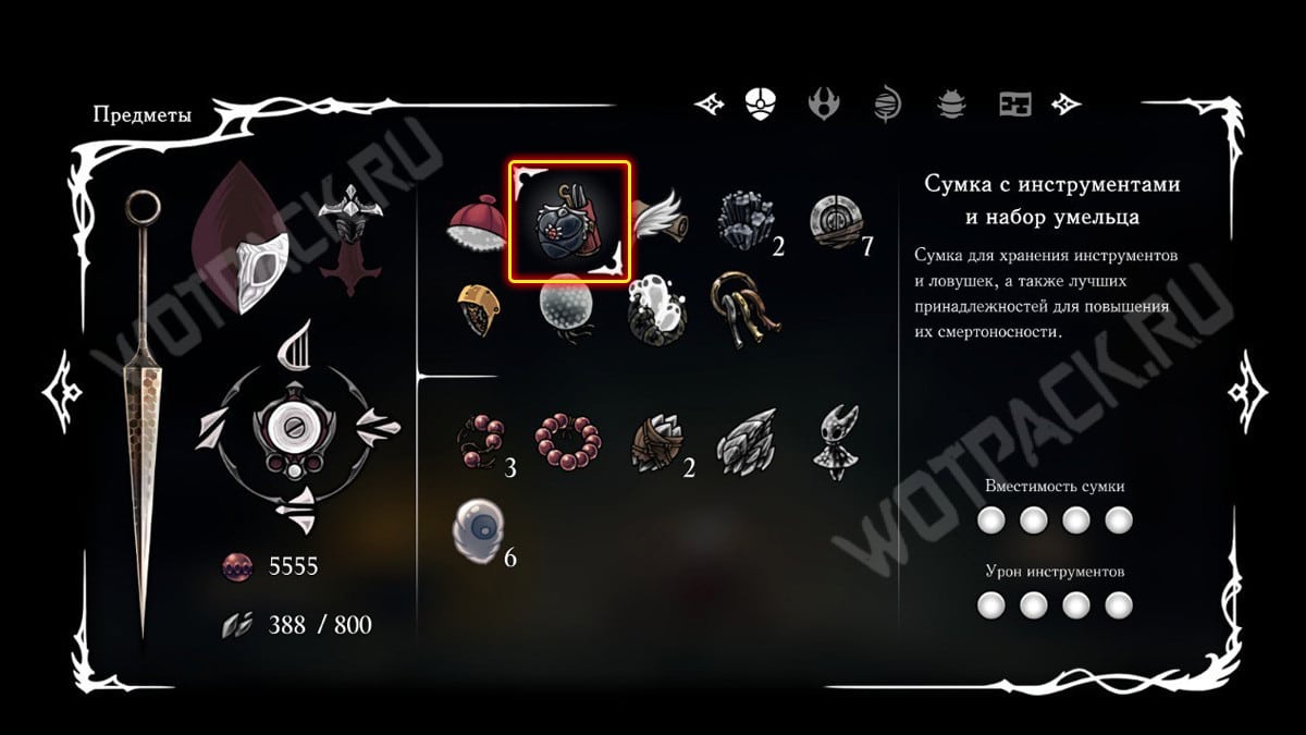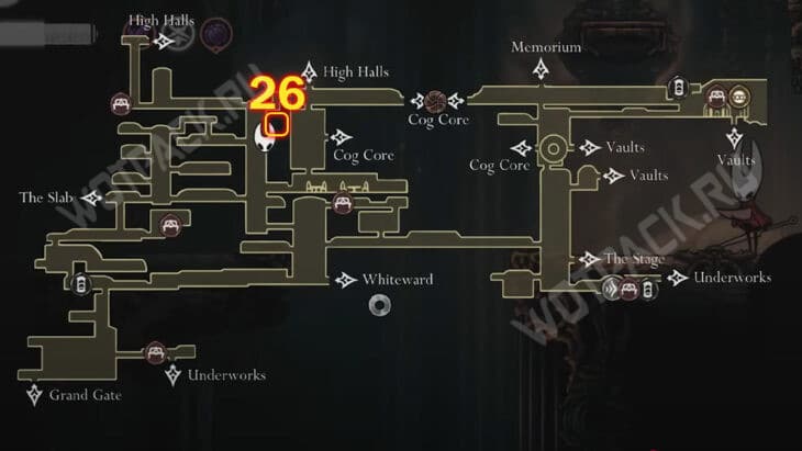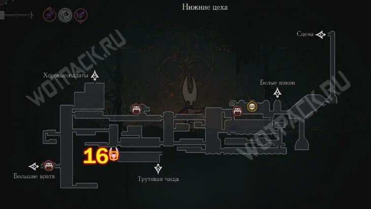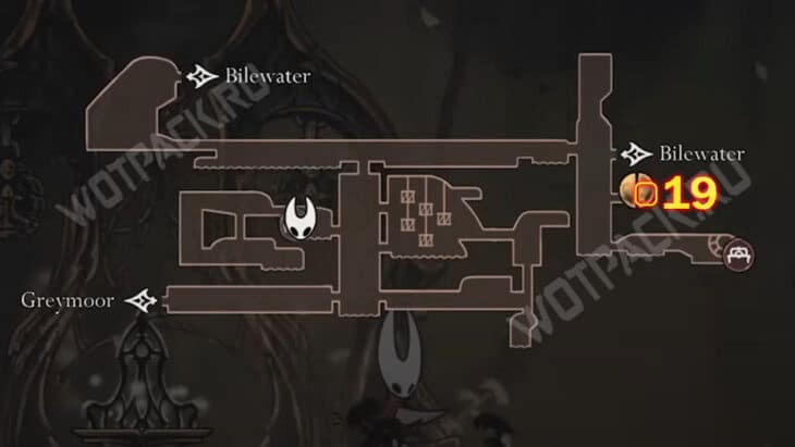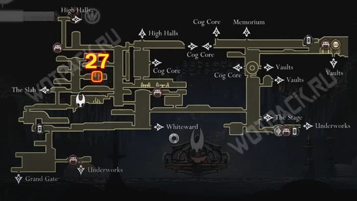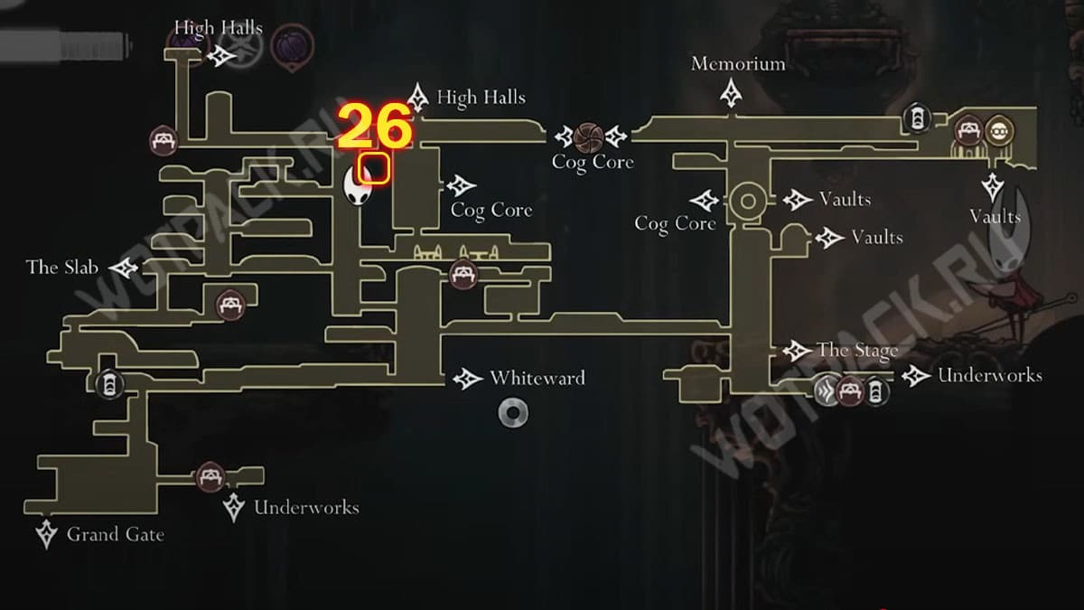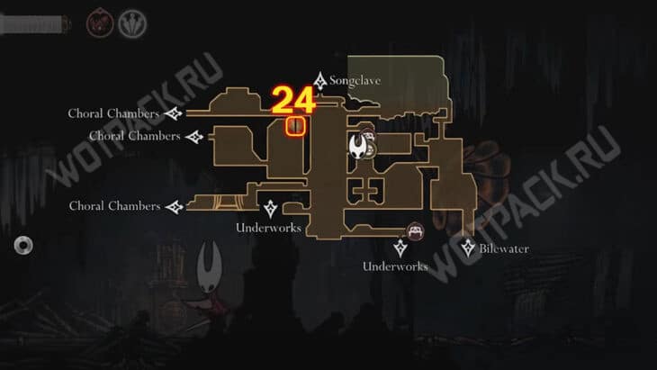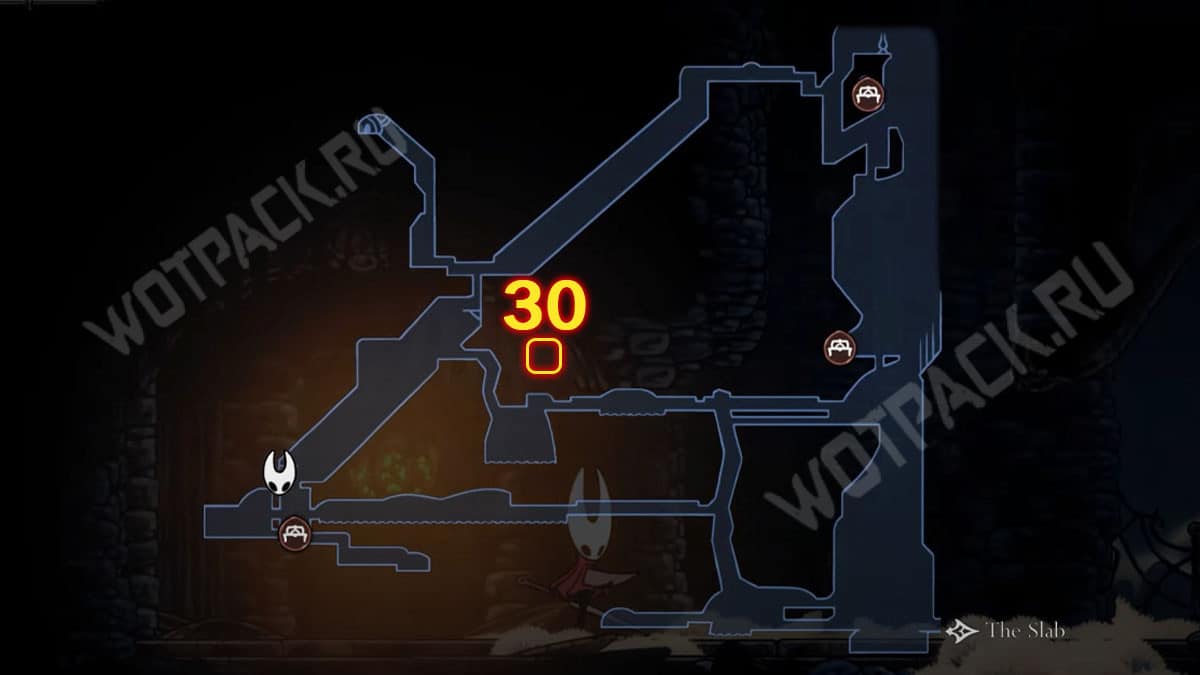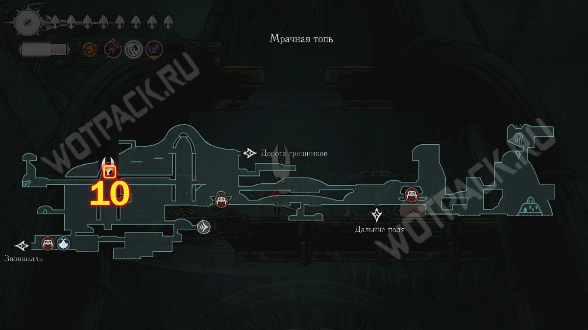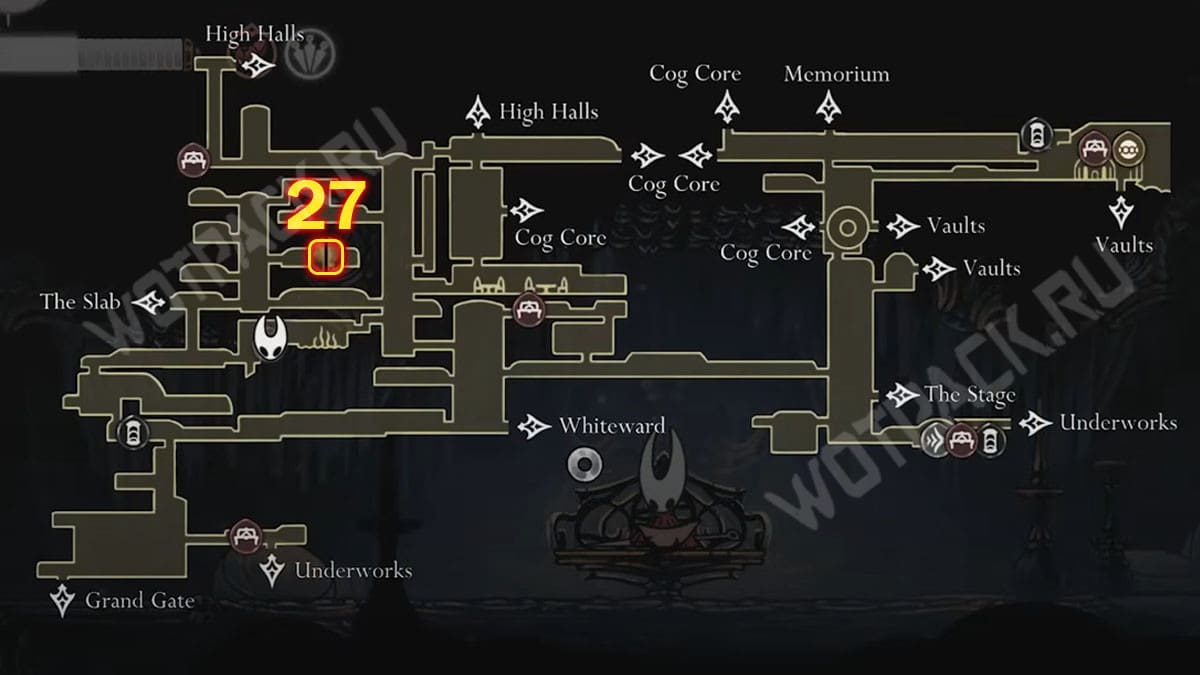 Возвращайтесь в Дальние поля после разблокировки цепкого захвата и удобного знака. Подъем к тайной комнате начинается в нижней части Глубоких доков в лабиринте, состоящем из красных шипов и воздушных потоков. В конечной пещере победите большого рогатого жука и проникните к крохе через восточный лаз в углу.
