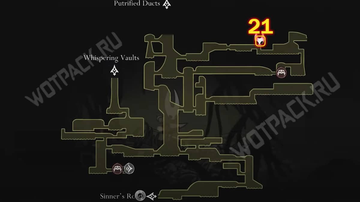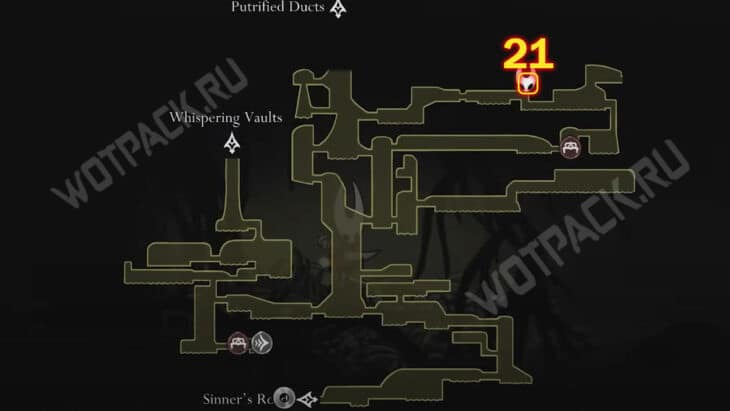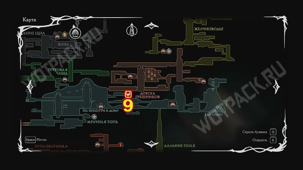 Отправляйтесь в подлокацию Выпускной орган: туда можно попасть из Дороги грешников, преодолев Мглу, или же добравшись по сюжету во второй акт. В центре помещения расположена постройка, через которую можно проникнуть в скрытый район с запутанной системой коридоров, наполненных потоками горячего воздуха и острыми шипами. Через трубы по дуге обогните постройку, чтобы обнаружить северо-западный выход, после чего проскачите до левой тупиковой пещеры.