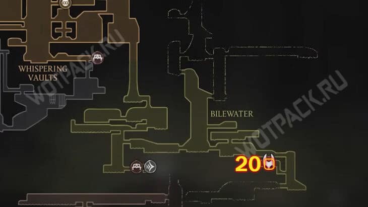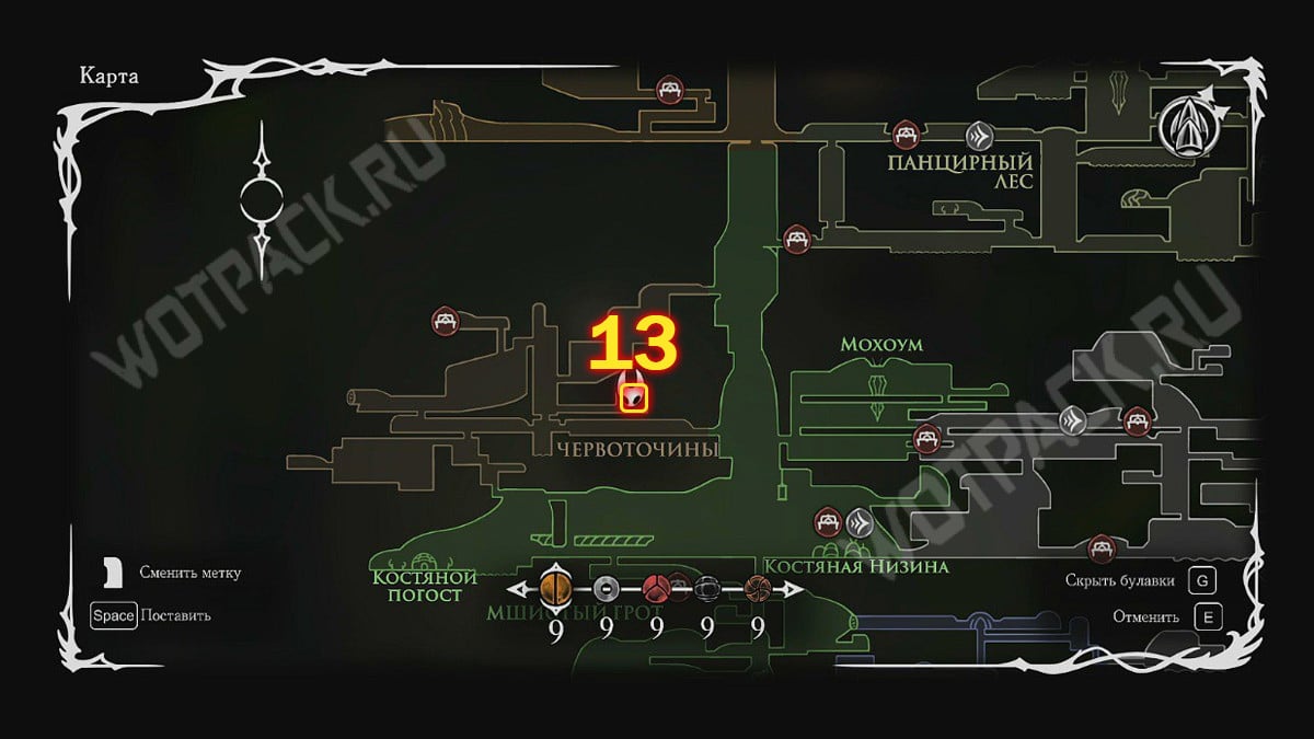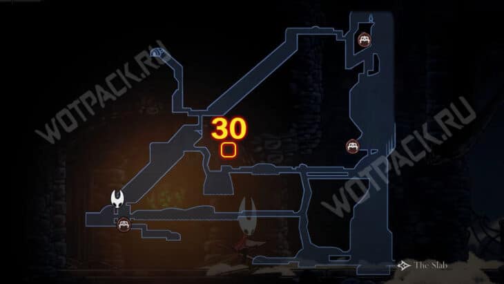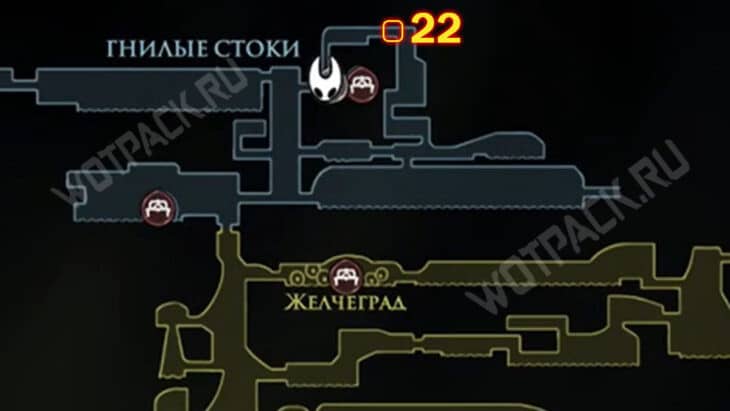 От северо-восточной лавки поднимитесь в узкий проем с правой стороны Желчеводья. Через узкую сеть тоннелей проскользните до первой лужи с личинками: встаньте в нее, взберитесь наверх и доберитесь до следующего опасного водоема. От него уже стремитесь к дальней западной стене и по ней взбирайтесь в тайный проход с ловушками, за которыми находится найденыш.