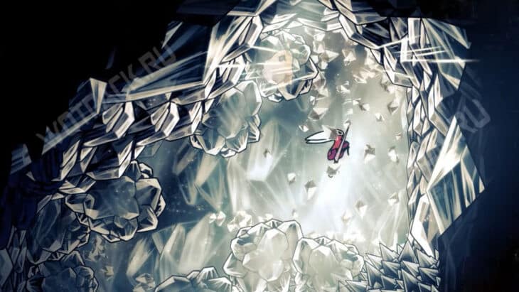 Используйте подъемник в Звонвилле, чтобы очутиться на арене, где ранее победили босса Вдову. С этого места продолжайте подъем по узким тоннелям, остерегаясь больших насекомых — от них можно спрятаться в боковых тупичках. В наивысшей точке будет ловушка с падающими колокольчиками: дождитесь безопасного момента и перепрыгните к западному ответвлению с застрявшим малышом.