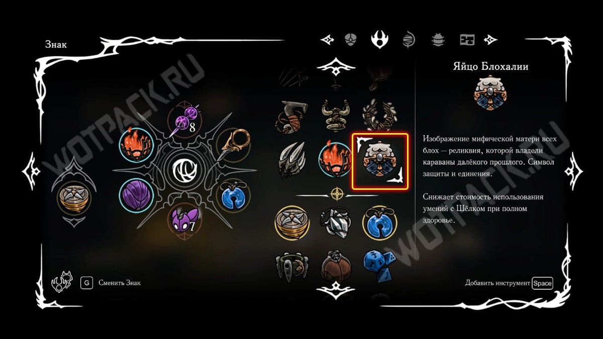 После возвращения всех заблудших сородичей Мушке, обязательно отыщите его в Блошетопии, чтобы забрать заслуженную награду. Реликвия Яйцо Блохалии пассивно уменьшает затраты шелка на применение умений, если у героини полный запас здоровья. Артефакт отлично комбинируется со многими знаками и значительно упрощает прохождение финального сюжетного акта.